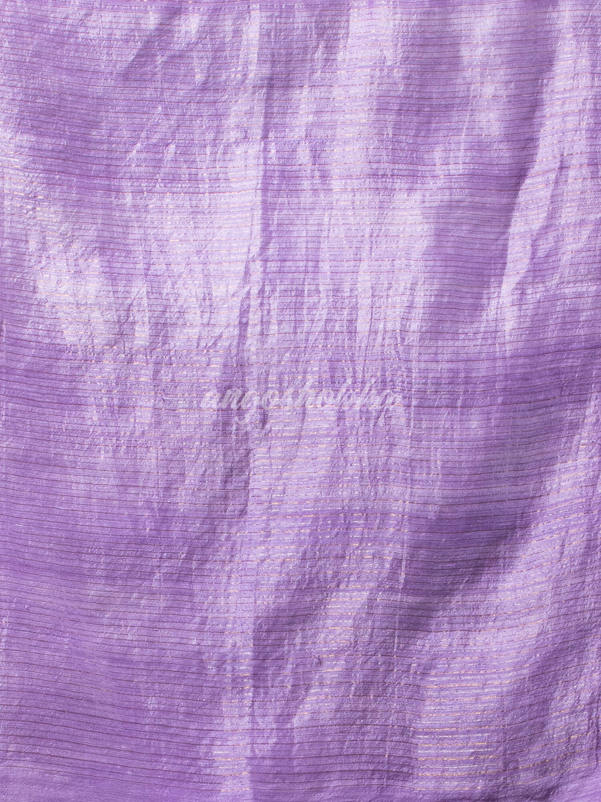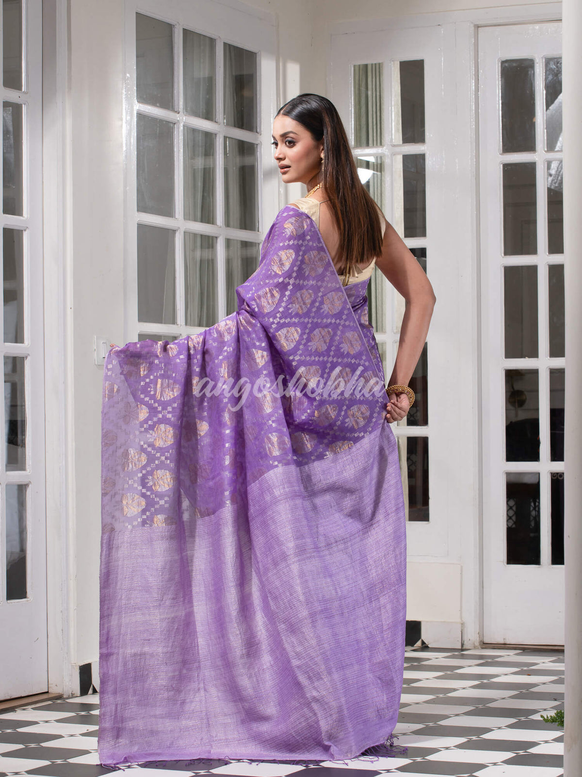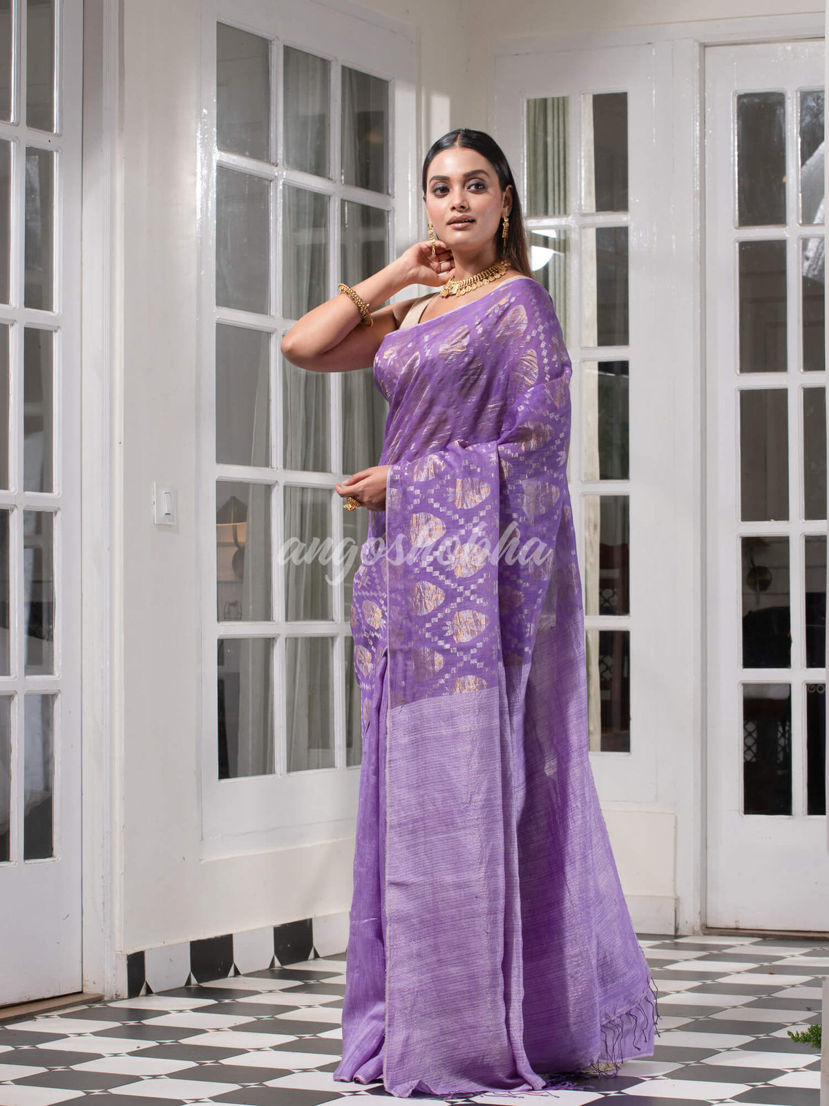 Purple Silk Matka Body with Leaves Intricate Design including Silver & Golden Stripes on Check Pallu Handwoven Saree
