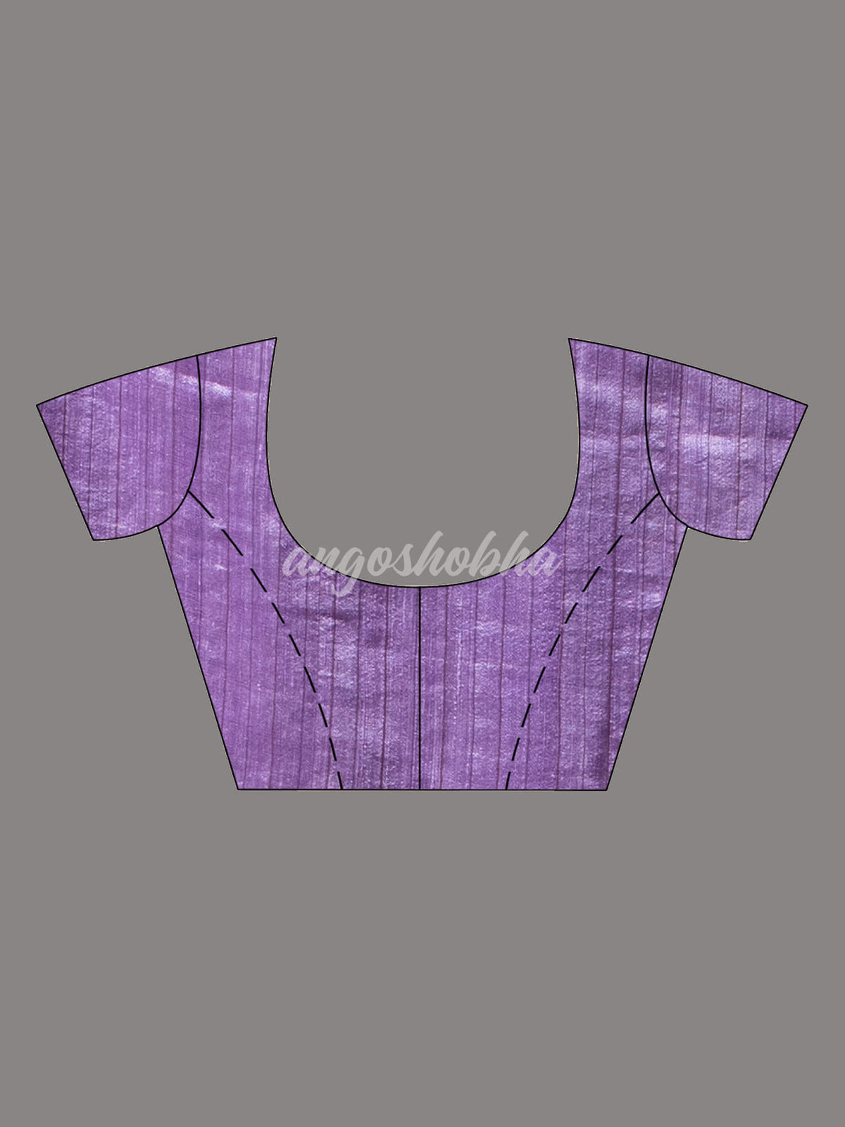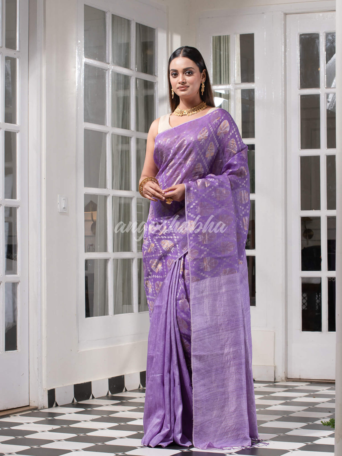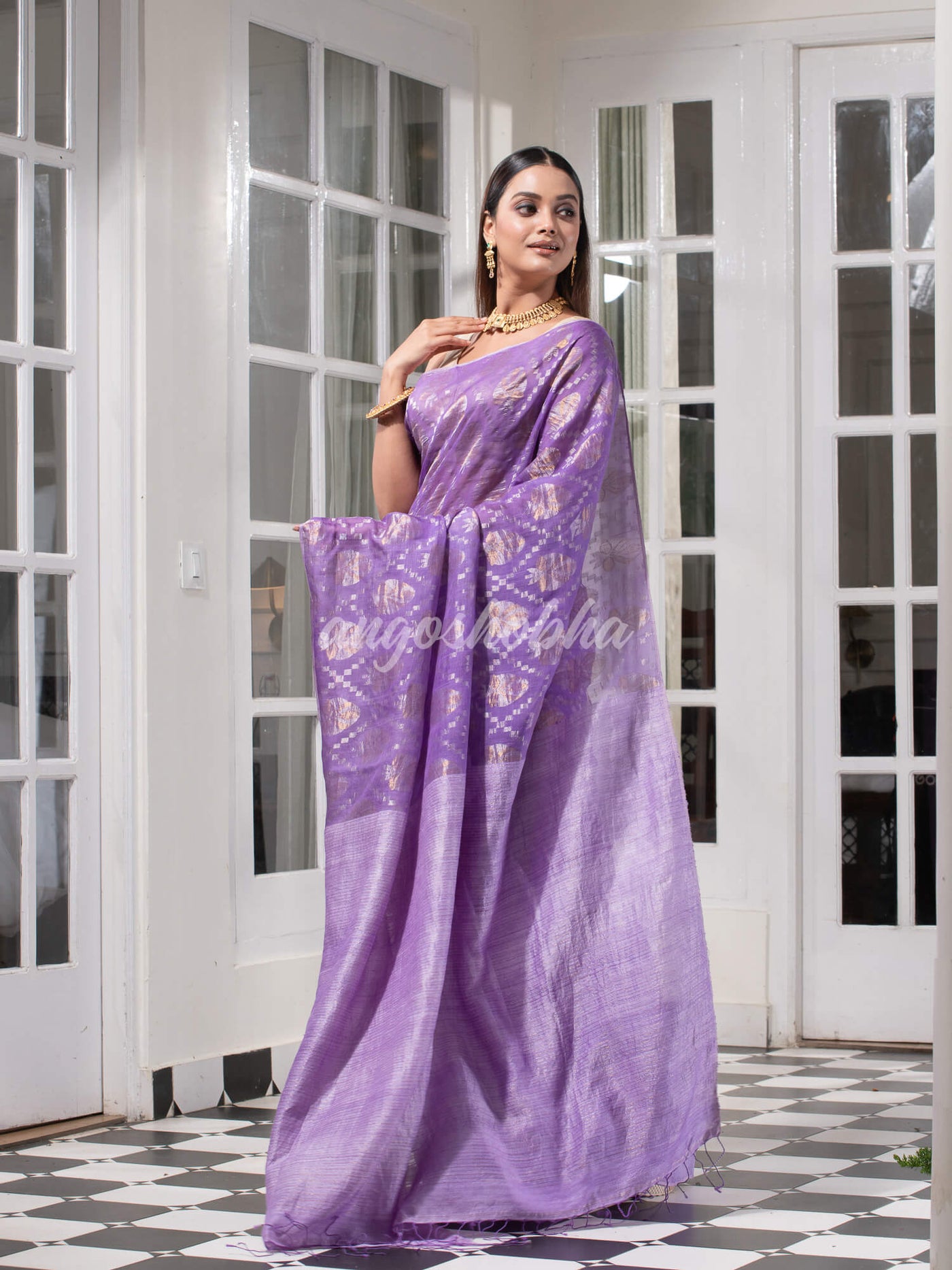Purple Silk Matka Body with Leaves Intricate Design including Silver & Golden Stripes on Check Pallu Handwoven Saree