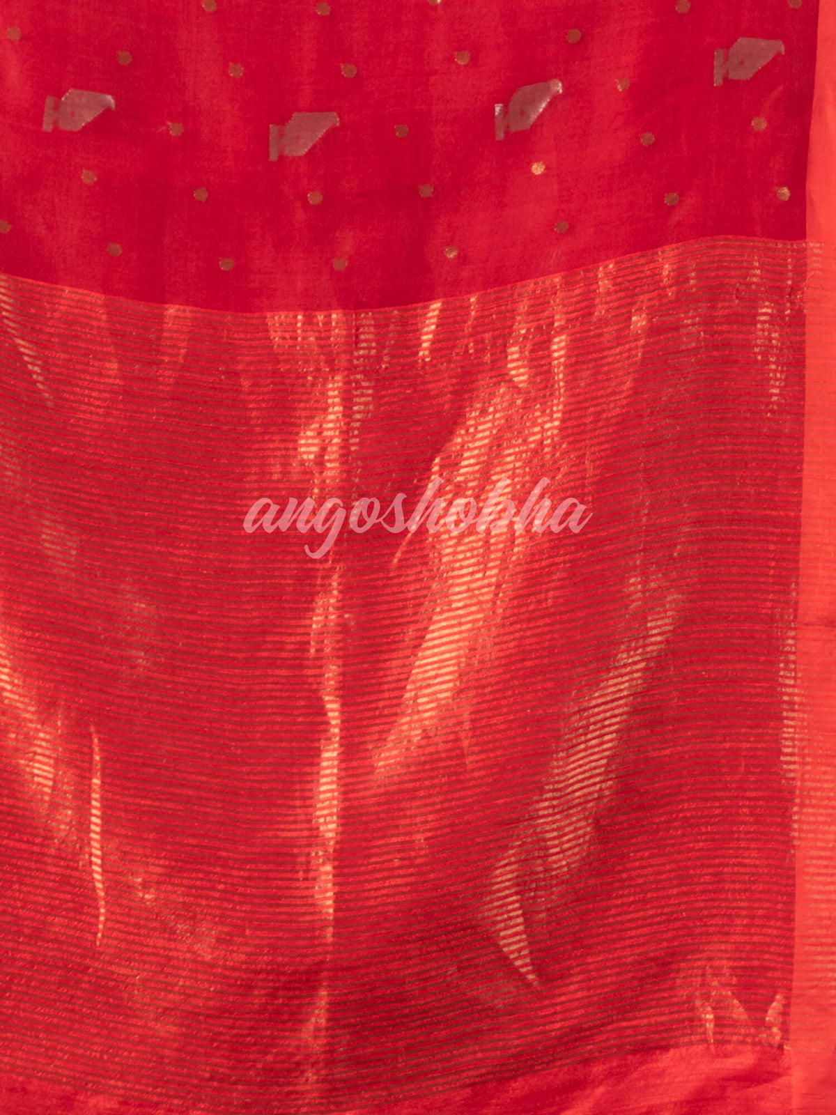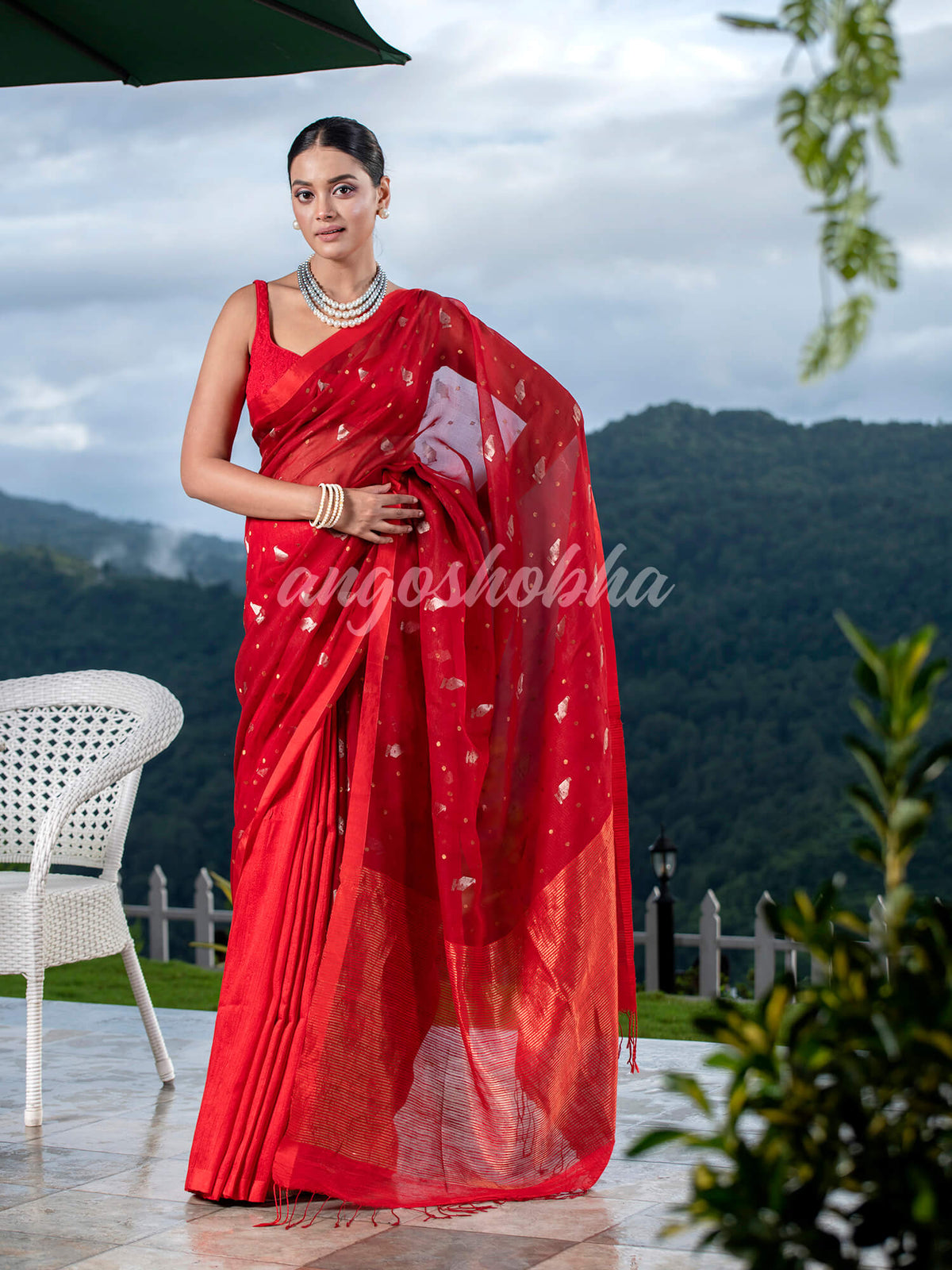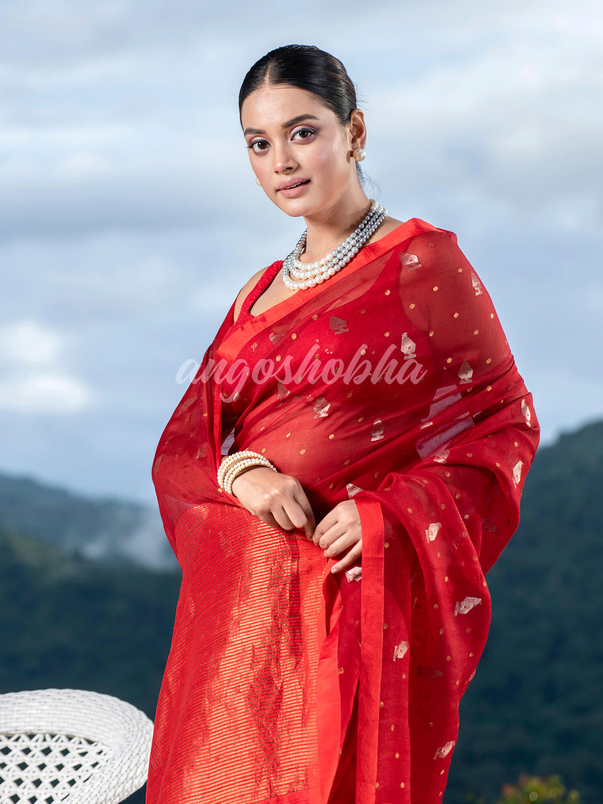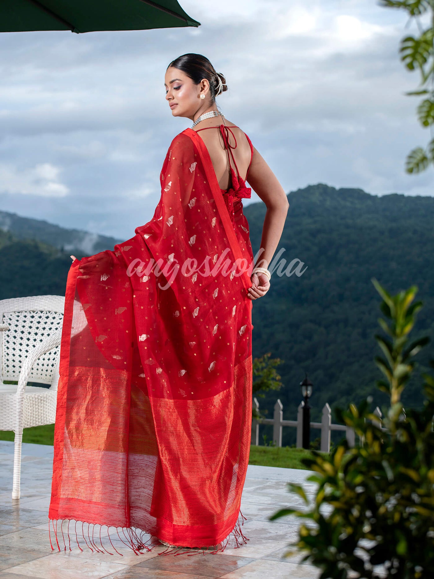 Description : This Red Half-Half Matka Silk Handwoven Saree presents a contemporary twist on traditional elegance. It features a unique dual-tone or dual-design concept across its two halves, both crafted from the distinctive, textured Matka silk. The plain red border reflects the shining of the saree with the sequins and leaf motifs glance over the body of the saree. The hem of the saree is embellished with the red-golden check compilation check. The vibrant red hue, combined with the raw, rich feel of handwoven Matka silk, makes it a striking and modern yet culturally rooted choice for various occasions.