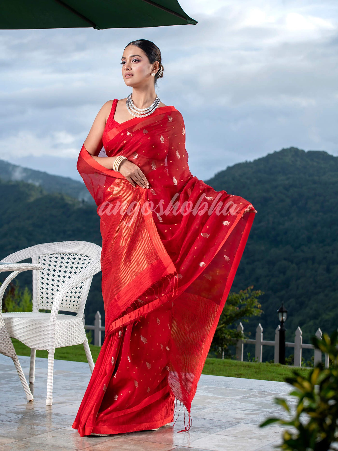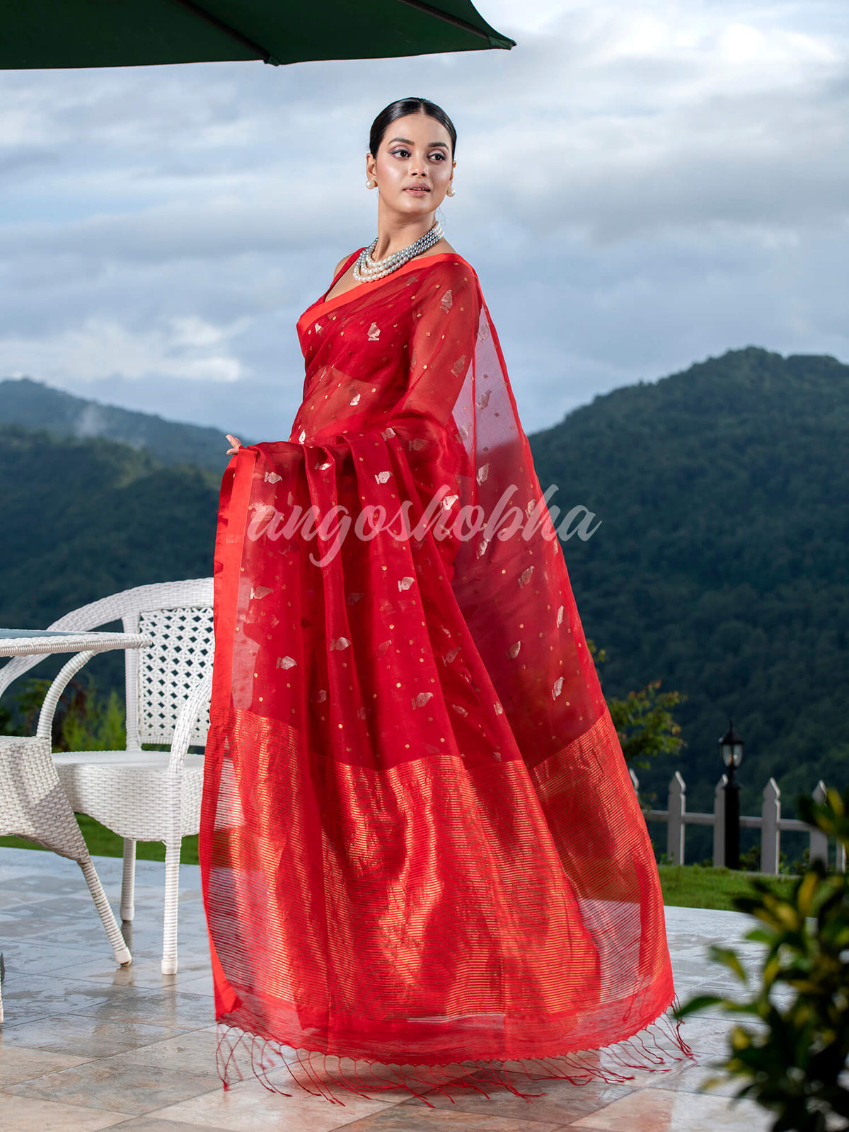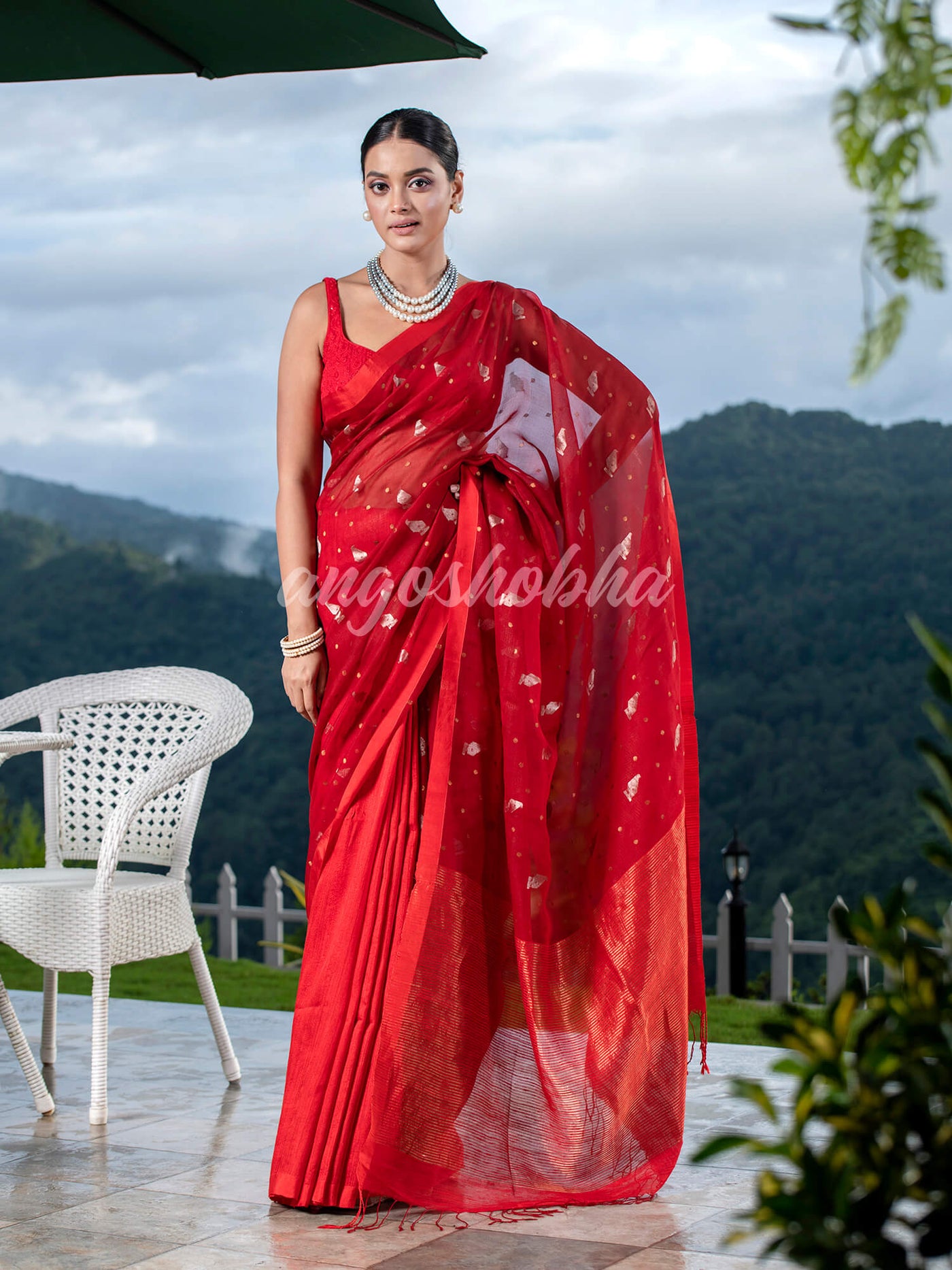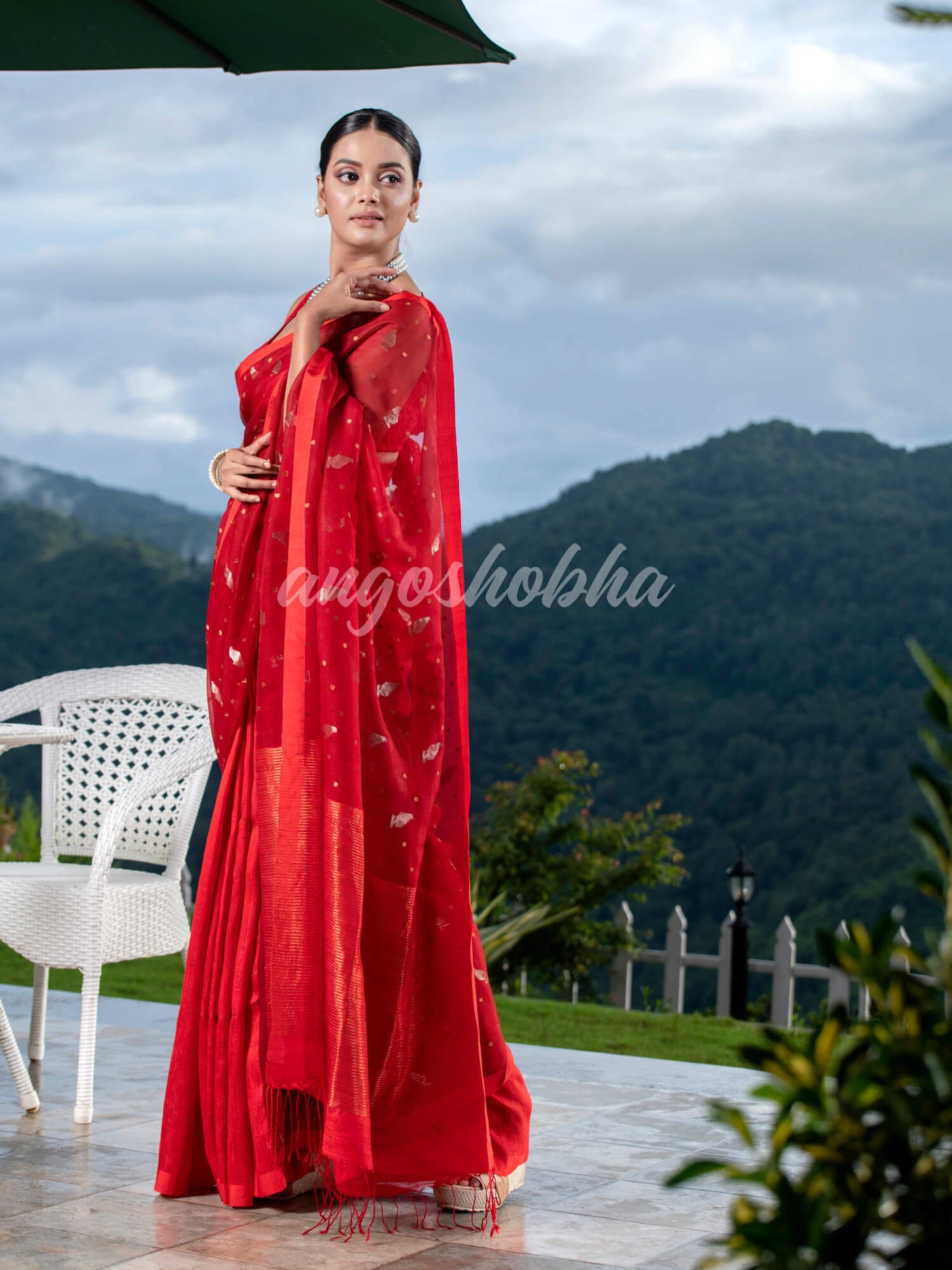Description : This Red Half-Half Matka Silk Handwoven Saree presents a contemporary twist on traditional elegance. It features a unique dual-tone or dual-design concept across its two halves, both crafted from the distinctive, textured Matka silk. The plain red border reflects the shining of the saree with the sequins and leaf motifs glance over the body of the saree. The hem of the saree is embellished with the red-golden check compilation check. The vibrant red hue, combined with the raw, rich feel of handwoven Matka silk, makes it a striking and modern yet culturally rooted choice for various occasions.