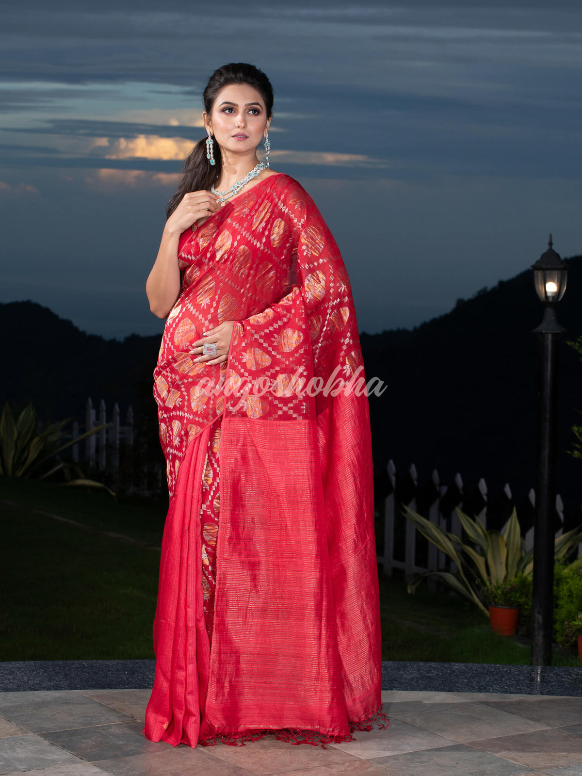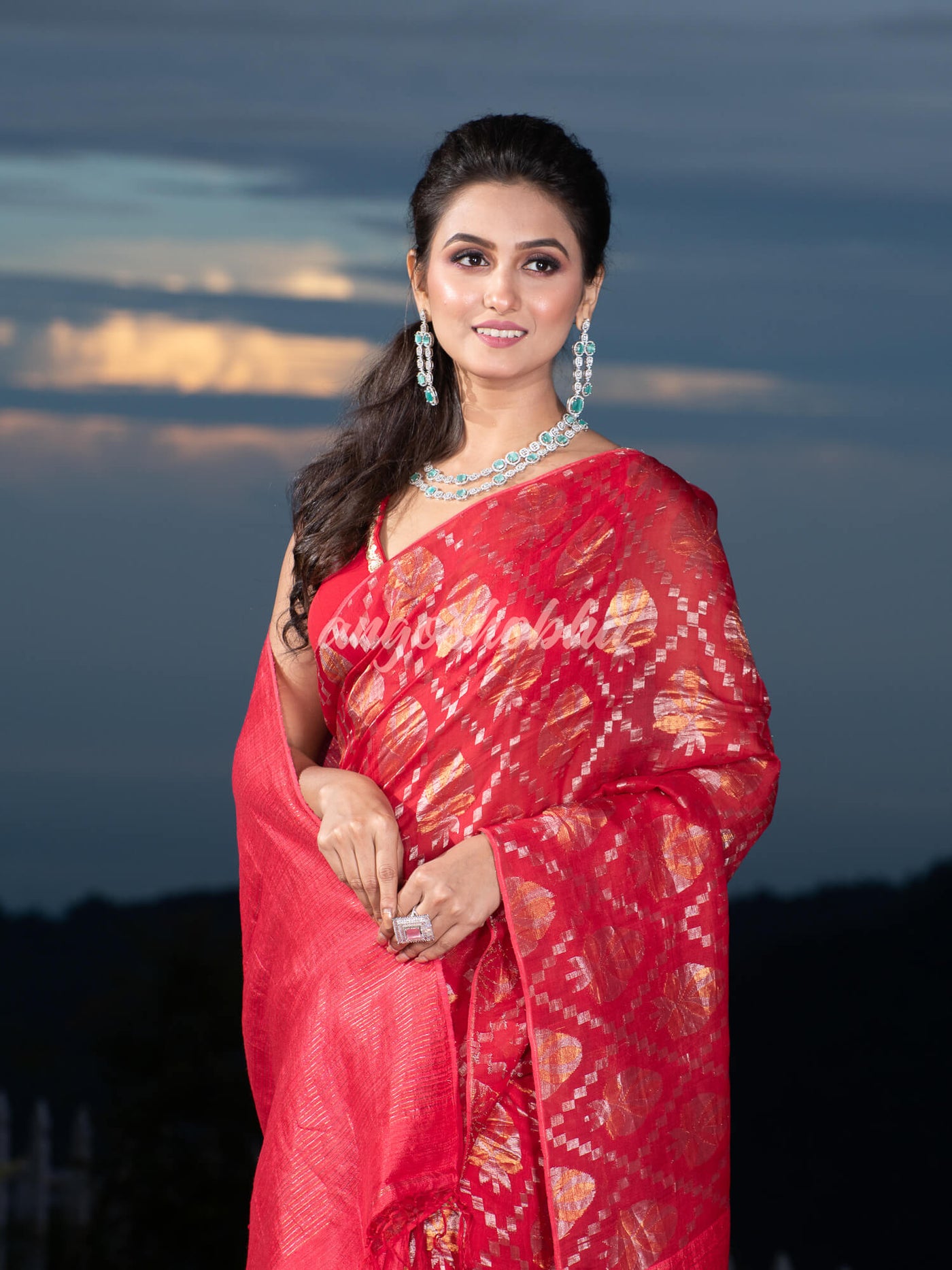 Description : This Red Matka Silk Saree is known for it's unique, handspun texture, earthy appeal and subtle sheen achieved through the use of short matka silk fibers and manual spinning. The hem is crafted from high quality golden zari check compiled with red color silk . It is considered a sustainable and eco-friendly choice due to the traditional ,labor-intensive weaving process. This saree has come running red color blouse. The natural sheen of silk combined with the textured surface gives Matka Silk Saree an elegant and sophisticated look. Making it suitable for both casual and formal occasions.