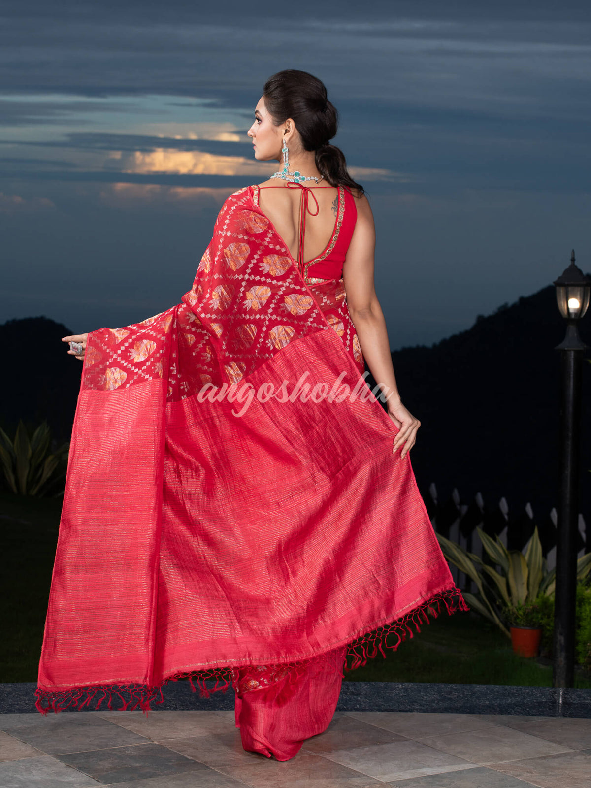 Red Silk Matka Body with Leaves Intricate Design including Silver & Golden Stripes on Check Pallu Handwoven Saree