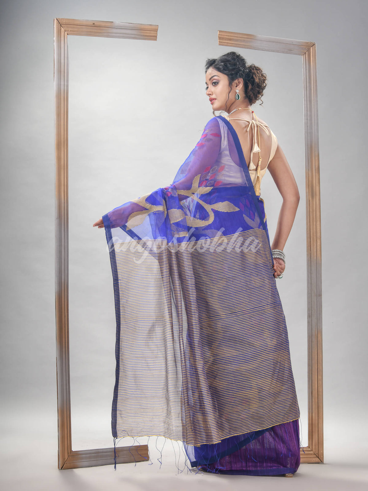 Royal Blue Silk Matka All Body Motive With Pallu Stripe Jamdani Saree