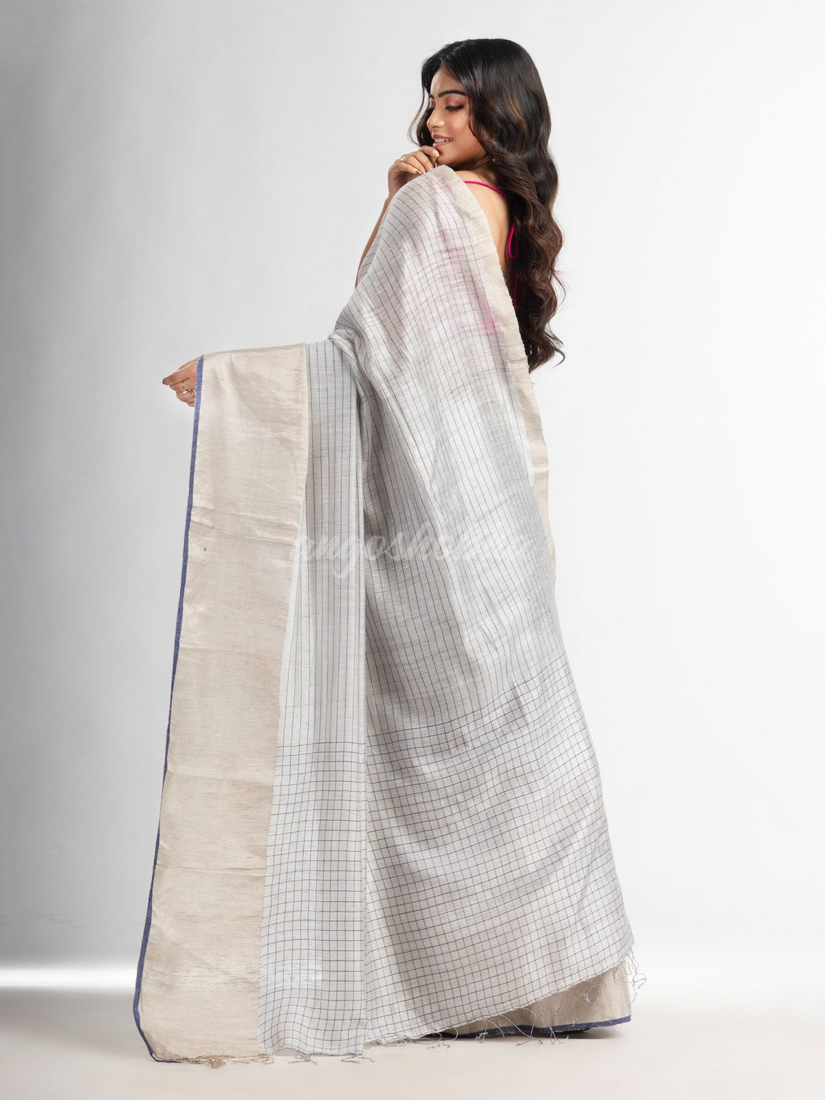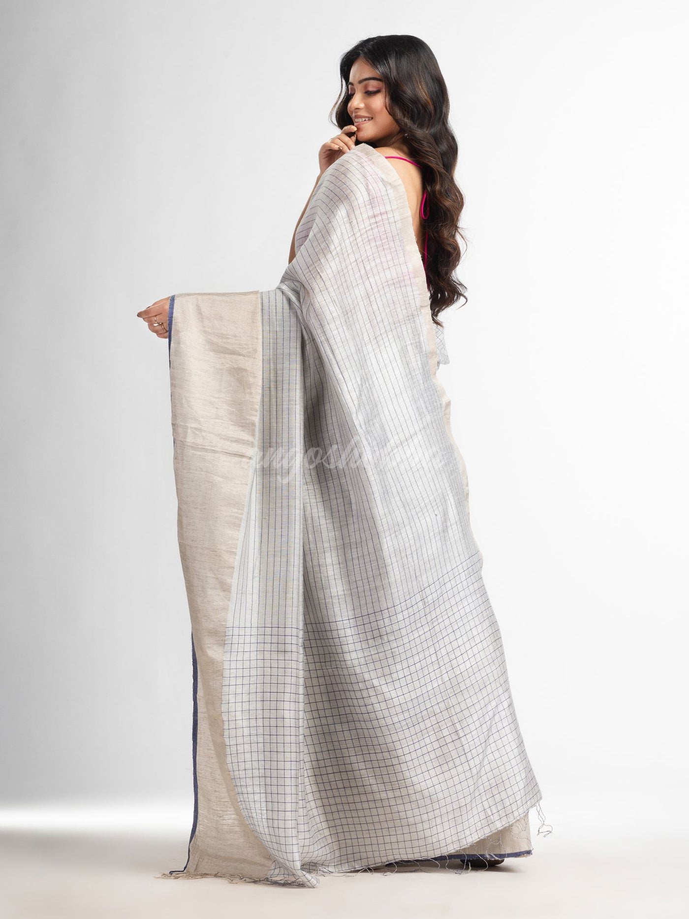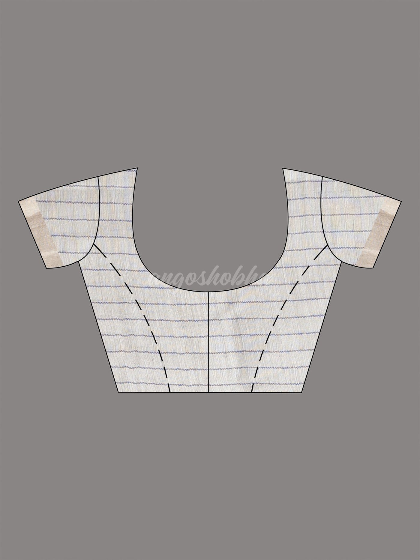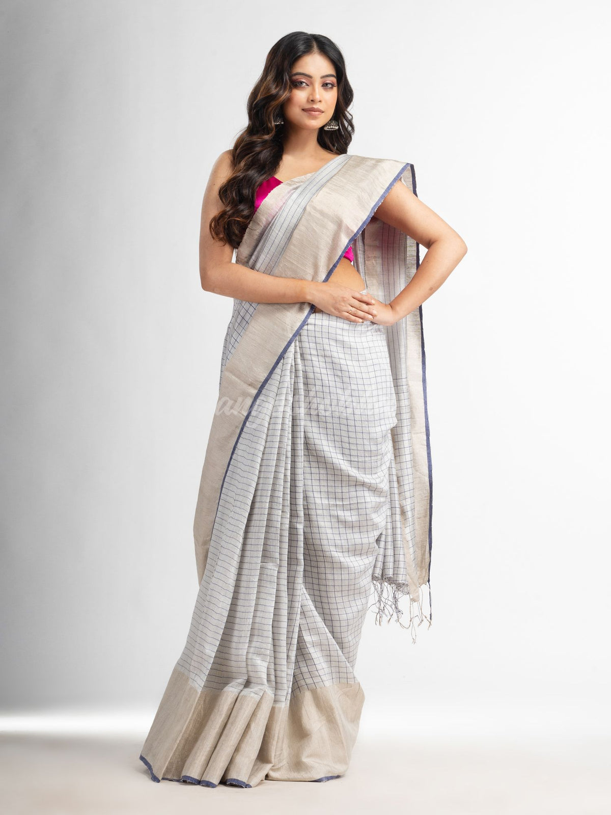 Description: A cascaded realm of quintessential beauty, this Traditional Silver silk matka check  saree.the saree all body zari check.the boder of the saree is blue  colour.with pallu kota check & silver colour blouse piece.