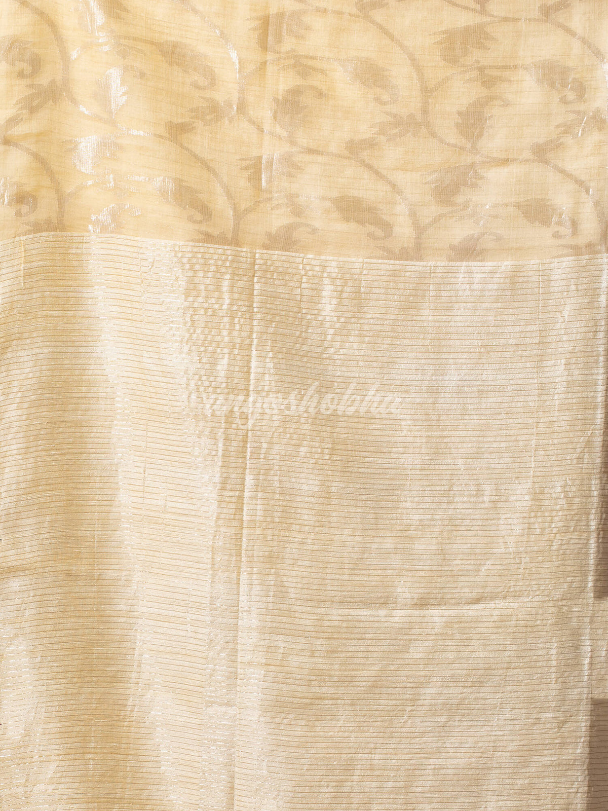 Description: Choosing a Champagne skin tone saree color that complements your fashion and enhance your natural radiance. It creates a more flattering look with its unique  creepers  silver zari texture all over the body pattern. Ribbon border thread offers a fantastic canvas for various shades. The hem of the saree is embellished through silver check on the champagne color. The blouse is attached with this masterpiece. In essence, a Champagne matka silk saree is more than just an outfit.