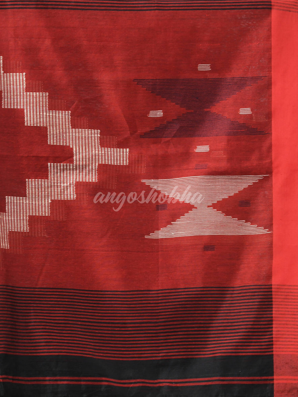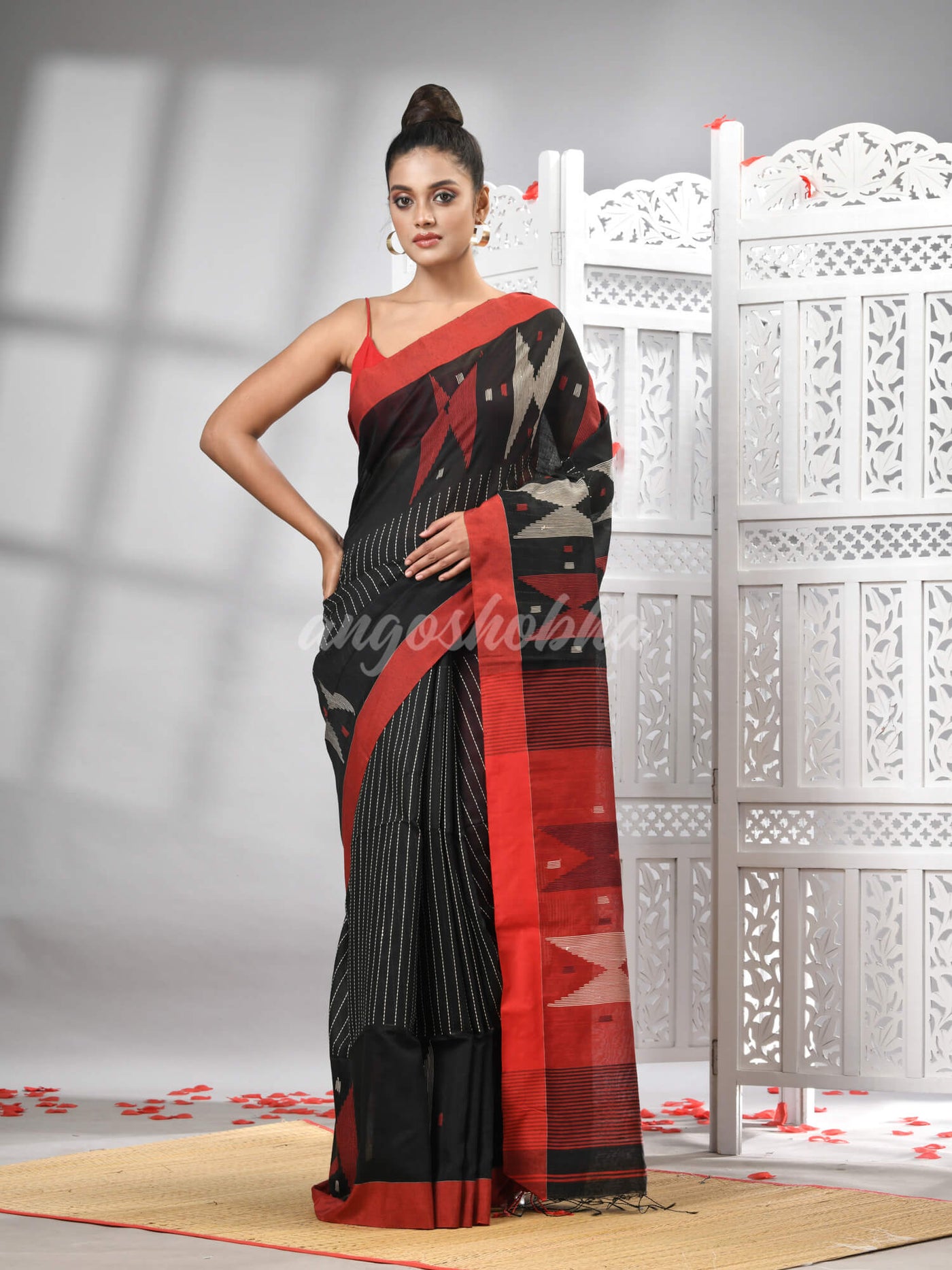 Black Cotton Blend All Body Motive With Red Pallu Handloom Saree
