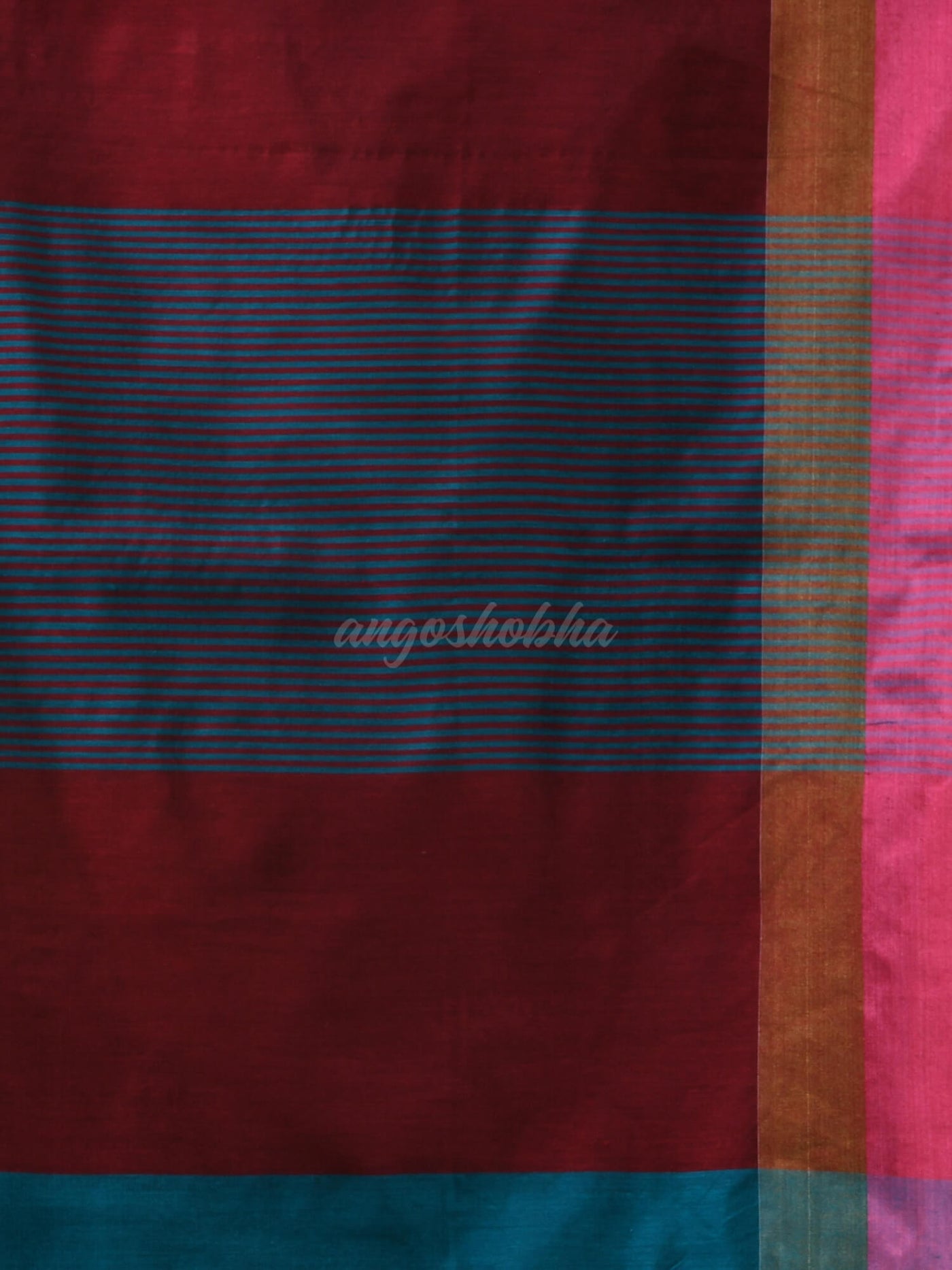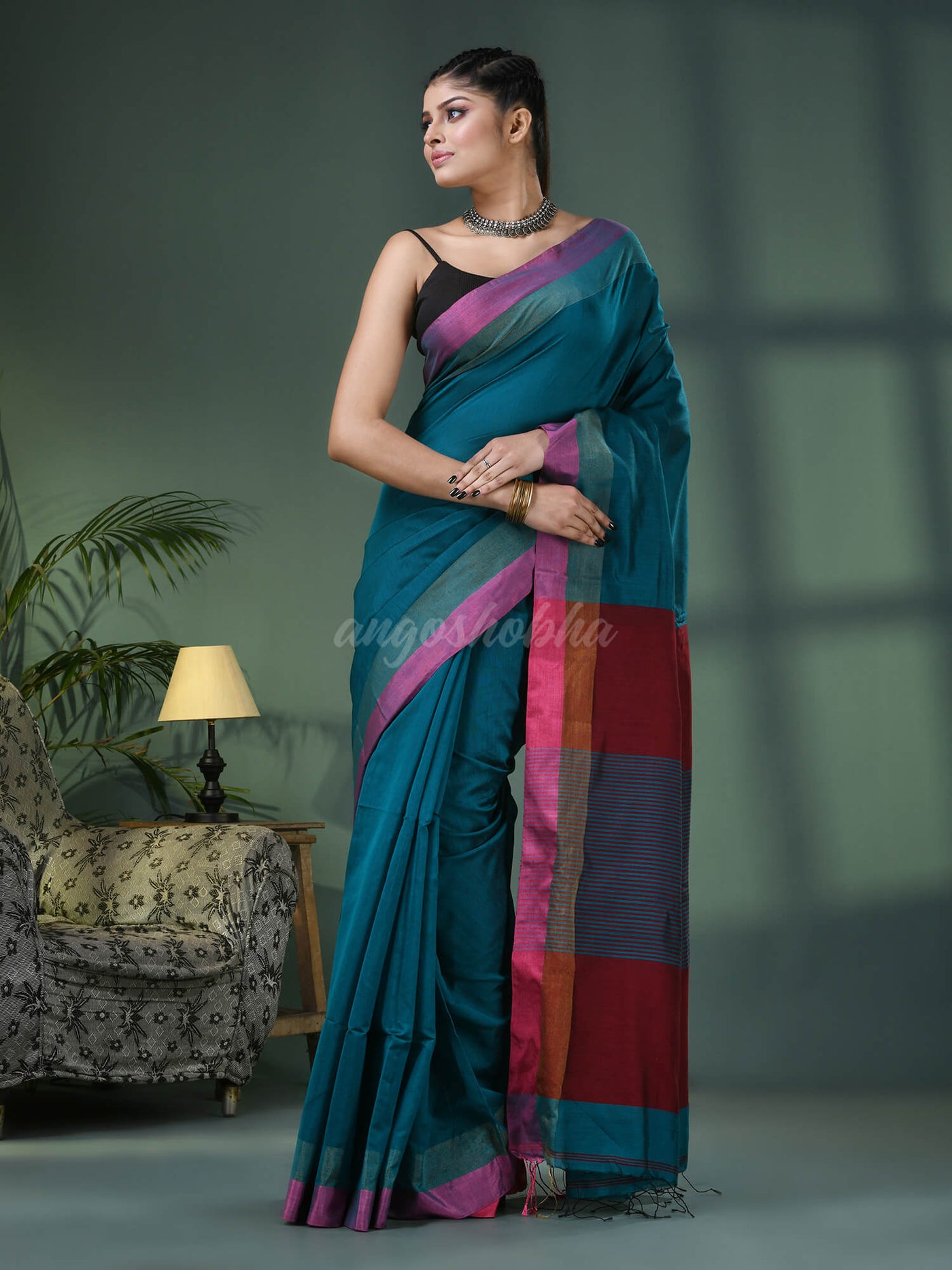 Deep Teal Cotton Blend Solid Border Handloom Saree