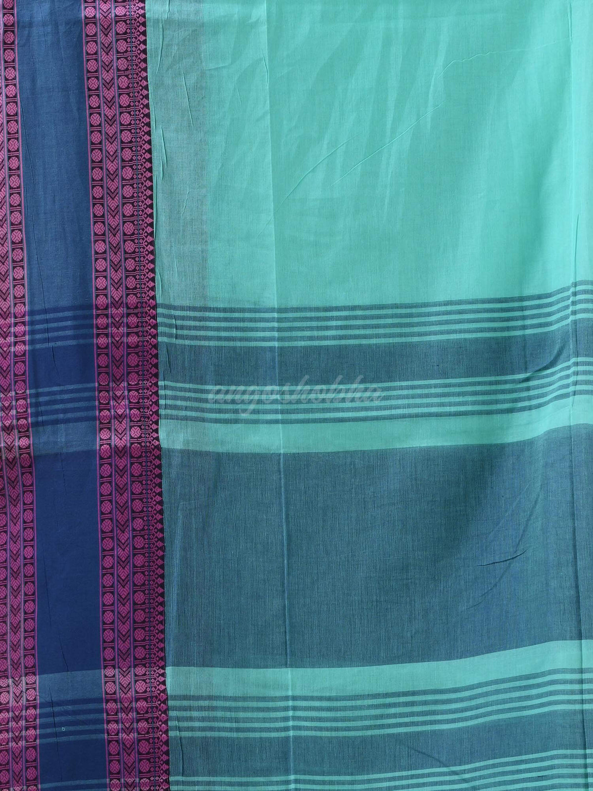 Description : Accentuate your ethnic ensemble by wearing this saree from Angoshobha. Sarees have their own grace, specially this one. This saree from Angoshobha is a beautiful Teal handloom cotton saree. the saree all body Solid. with jacquard design border.The pallu of the sareeis decorated with strip .The saree comes with a Teal colour running blouse piece. saree with jacquard weaving  Crafted in a cotton fabric, this beauty gives the most comfortable fit. Style it with minimal jewellery and high heels to slay the ethnic look.Colour hues may slightly vary from that which appears in the image