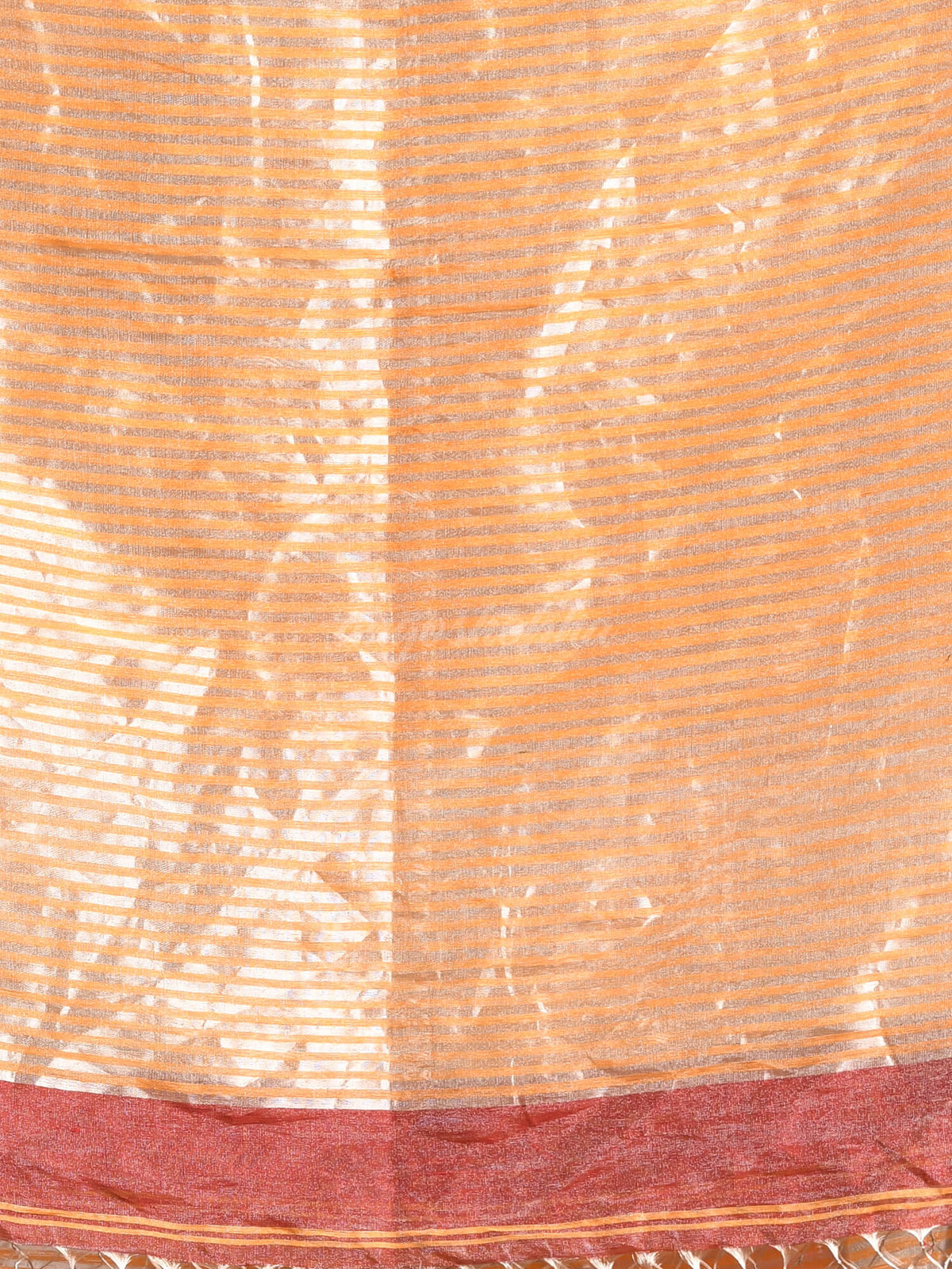 Description: Accentuate your ethnic ensemble by wearing this saree from Angoshobha. Sarees have their own grace, specially this one. This saree from Angoshobha is a beautifu Dark Peach Colour zari Linen Handwoven Saree.The Saree Dark Peach Colour Solid Body. With Silver Zari Broder. And Silver Zari Check Pallu. The Saree Comes With A Dark Peach Colour Running blouse piece attached. Crafted in a Zari Linen fabric, this beauty gives the most comfortable fit. Style of it with minimal jewellery and high heels to slay the ethnic look.You can wear anywhere and any festival moment with wonderful enjoyment.So collect this product and enjoy with wearing Zari Linen saree. Obviously you can trust on this collection. We are always with your fashion and choice.
