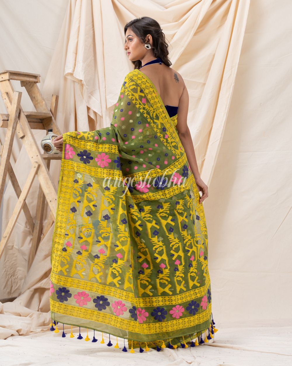 Traditional Green Yellow Soft Dhakai Jamdani Saree