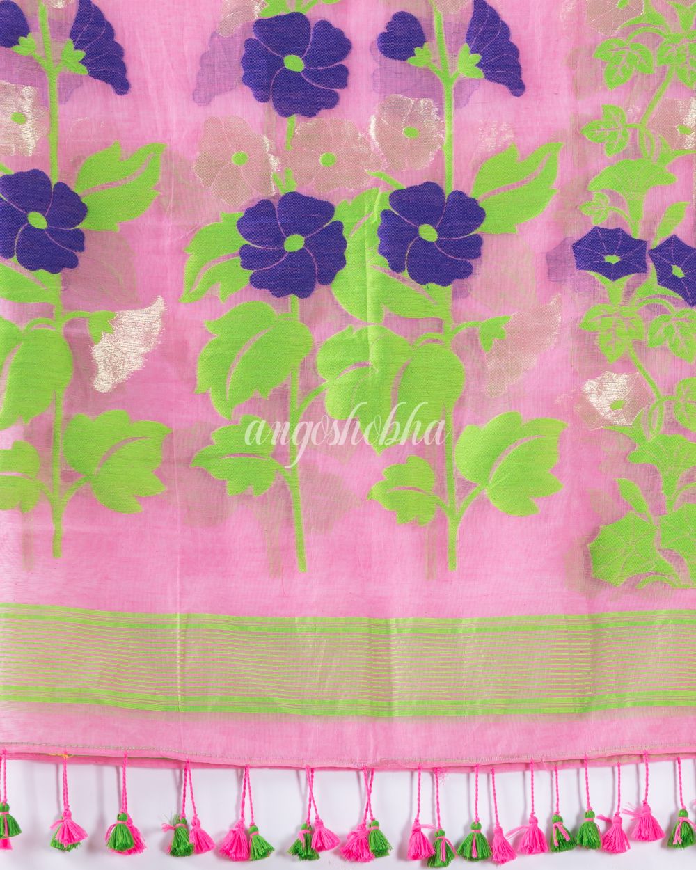 Description: Relaxed, chic outlines complemented with customary zari ,celebrates the substance of handwoven cotton blend Dhakai jamdani saree with astonishing zari outskirt green blue petunia floral delineation all over the pink plain crafted on the body. Fashion fades, yet style is interminable. This wonderful Dhakai saree, enhanced with cotton blend fabric and zari adjusted in the pallu intricate floral representation is without a doubt an urban classic , exemplary and is immortal in its allure. Plain border conjoined the petunia climber trees reflects the background of the saree just mind blowing. The pumpum is furbished with pink green colour combination.
