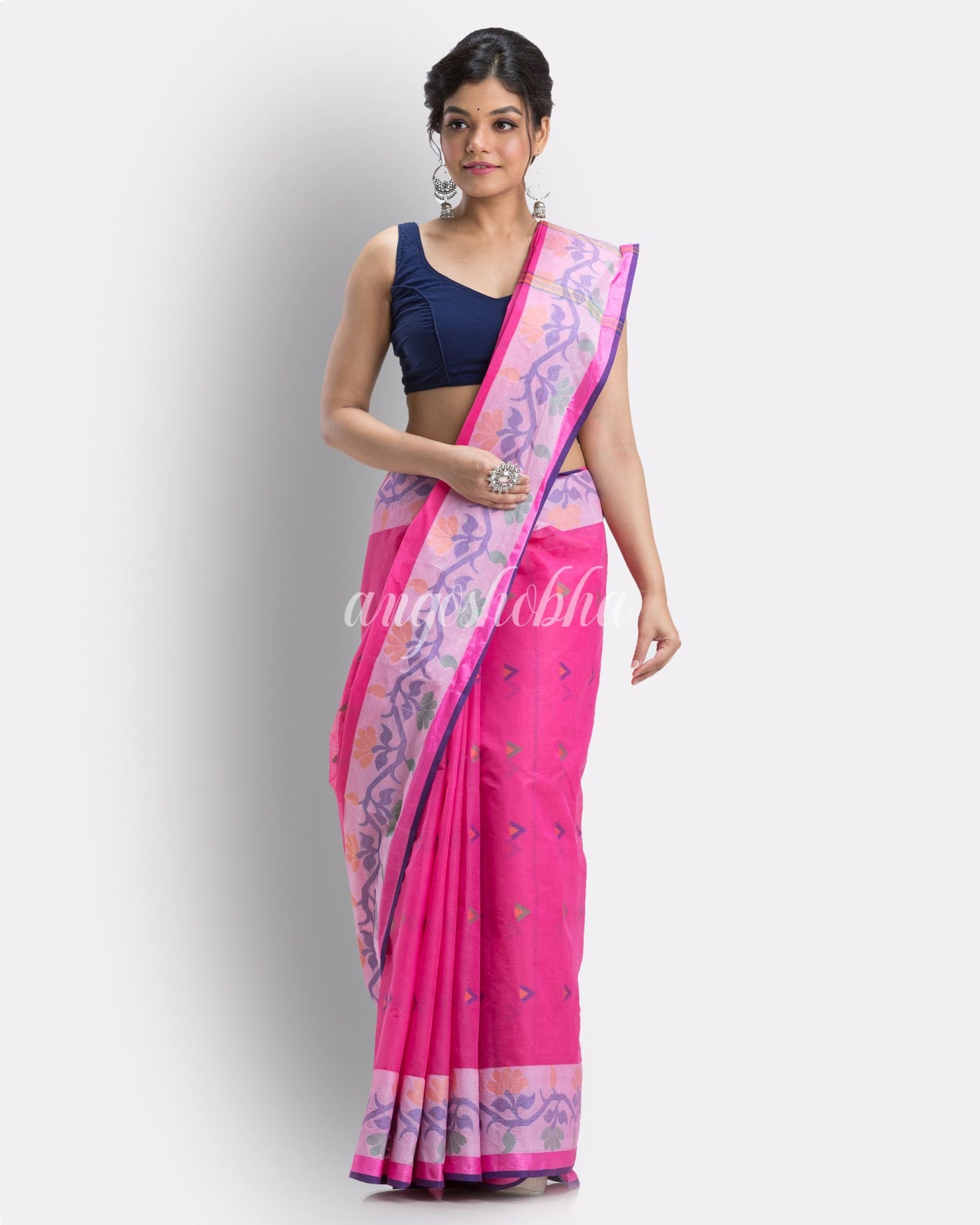 Description: Accentuate your ethnic ensemble by wearing this saree from Angoshobha. Sarees have their own grace, specially this one. This saree from Angoshobha is a beautiful pink handloom saree with jacquard weaving work creepers border all over.It comes with a vibrant blue yellow mix checks over the pink colors with motif pallu and an unattached blouse piece. Crafted in a cotton fabric, this beauty gives the most comfortable fit. Style it with minimal jewellery and high heels to slay the ethnic look.You can wear anywhere and any festival moment with wonderful enjoyment.So collect this product and enjoy with wearing cotton saree. Obviously you can trust on this collection.