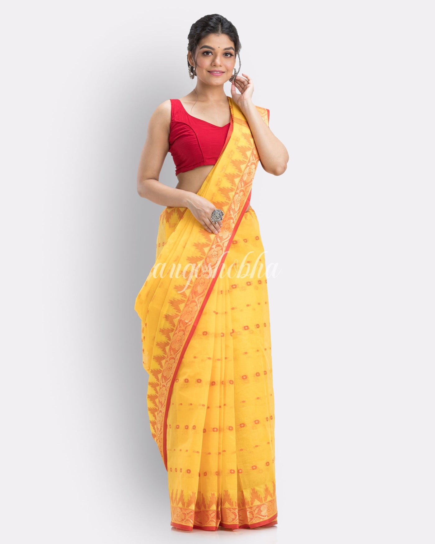 Description: Accentuate your ethnic ensemble by wearing this saree from Angoshobha. Sarees have their own grace, specially this one. This saree from Angoshobha is a beautiful yellow handloom saree with jacquard weaving work creepers boreder all over. It comes with red checks over the yellow spreading over the motif and an unstitched blouse piece. Crafted in a cotton fabric, this beauty gives the most comfortable fit. Style it with minimal jewellery and high heels to slay the ethnic look.You can wear anywhere and any festival moment with wonderful enjoyment.So collect this product and enjoy with wearing cotton saree. Obviously you can trust on this collection. We are always with your fashion and choice.