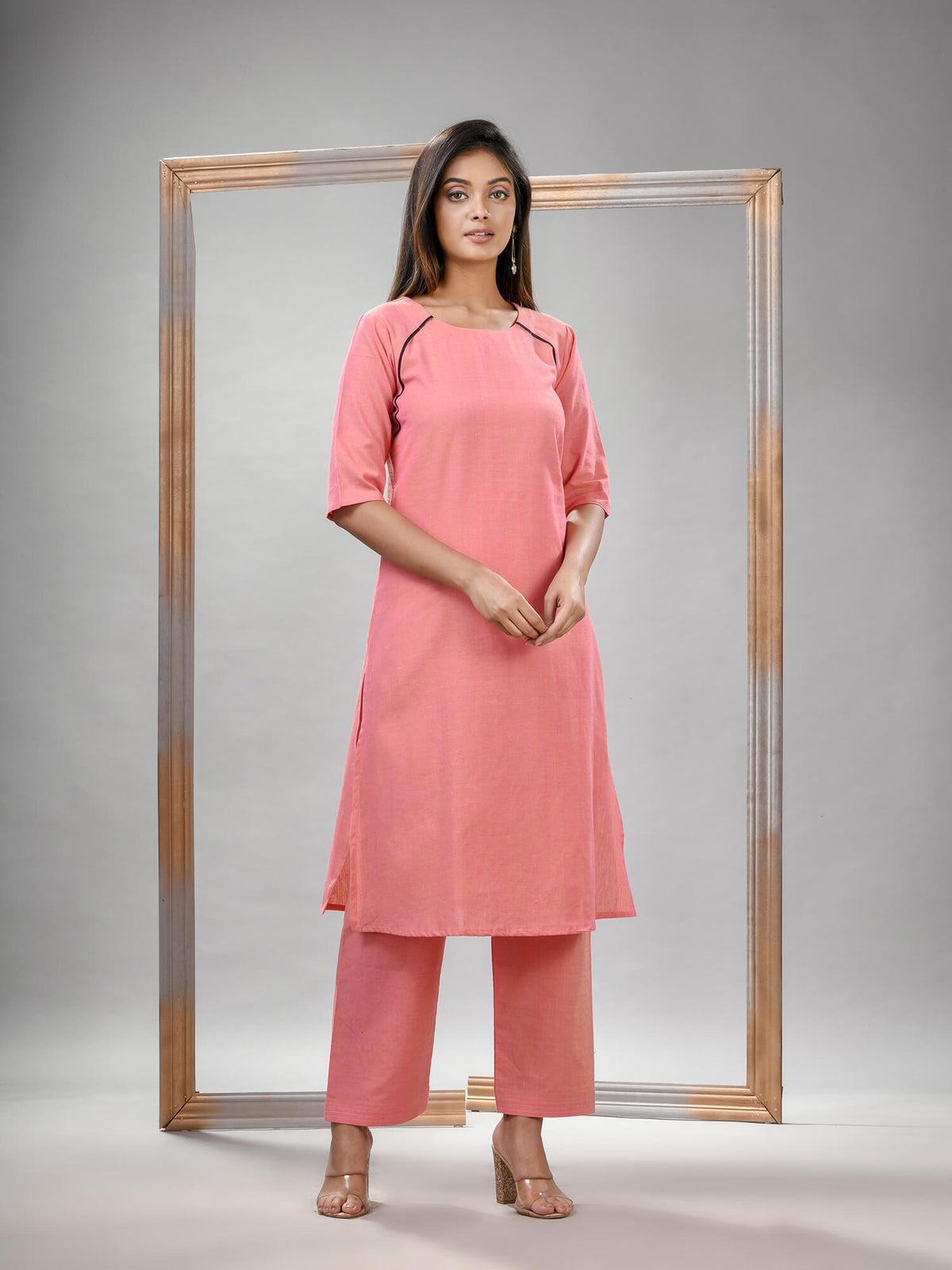 Peach Pink Cotton Bengal Handwoven Kurta Set