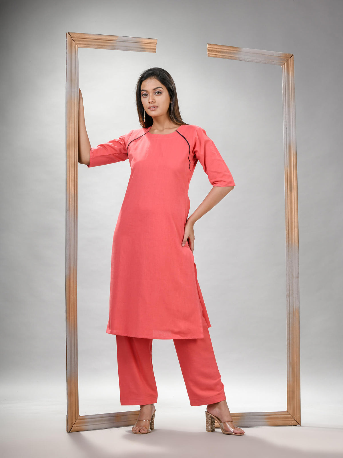 Peach Pink Cotton Bengal Handwoven Kurta Set