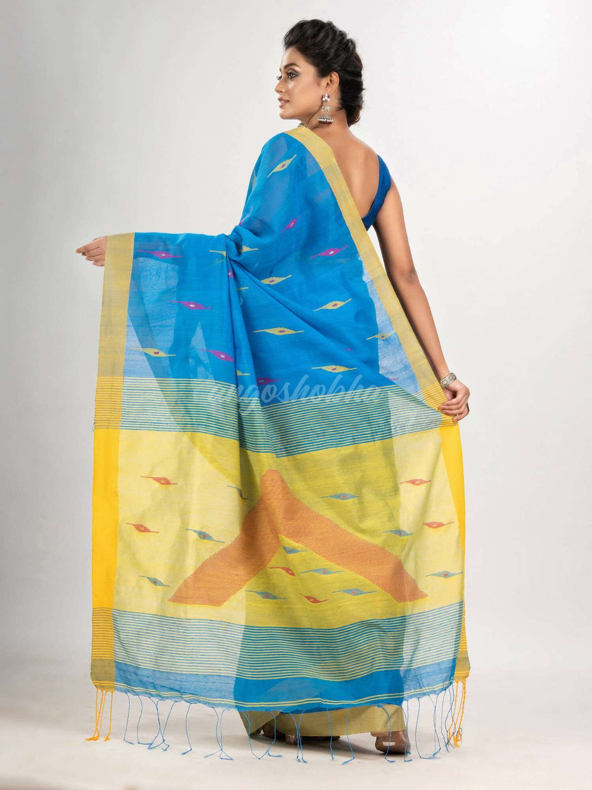 Auqa blue cotton blend all body motive with yellow pallu jamdani saree