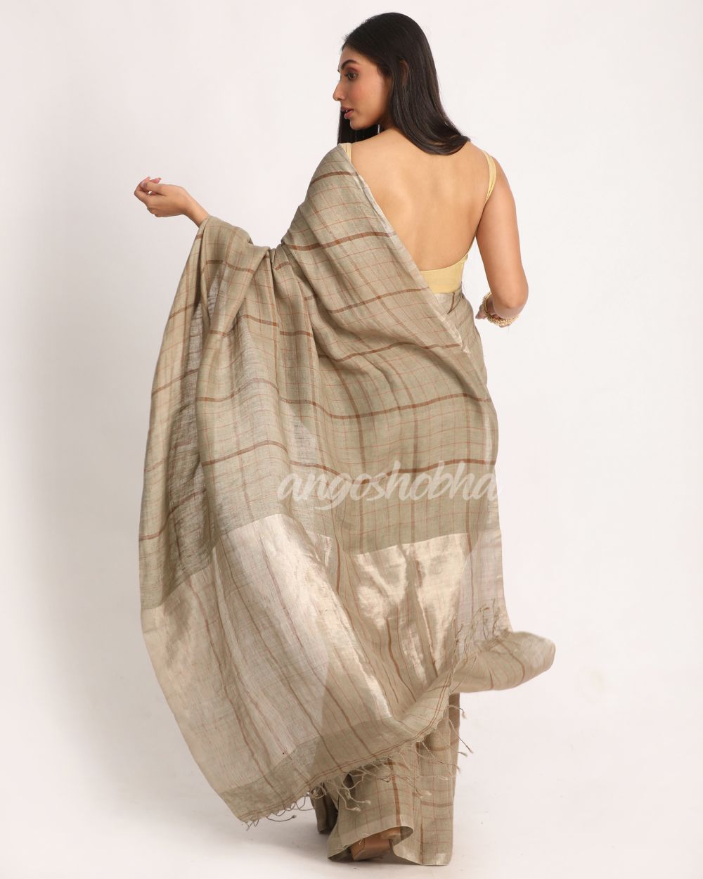 Description: Accentuate your ethnic ensemble by wearing this saree from Angoshobha. Sarees have their own grace, specially this one. This saree from Angoshobha is a beautiful beige handloom saree with handwoven check linen work all over.The border of the sari is disguised with silver color .The hem of the sari is disguised with beige and silver color combination and attached blouse piece. Crafted in a linen fabric, this beauty gives the most comfortable fit. Style of it with minimal jewellery and high heels to slay the ethnic look.You can wear anywhere and any festival moment with wonderful enjoyment.So collect this product and enjoy with wearing linen saree. Obviously you can trust on this collection. We are always with your fashion and choice.