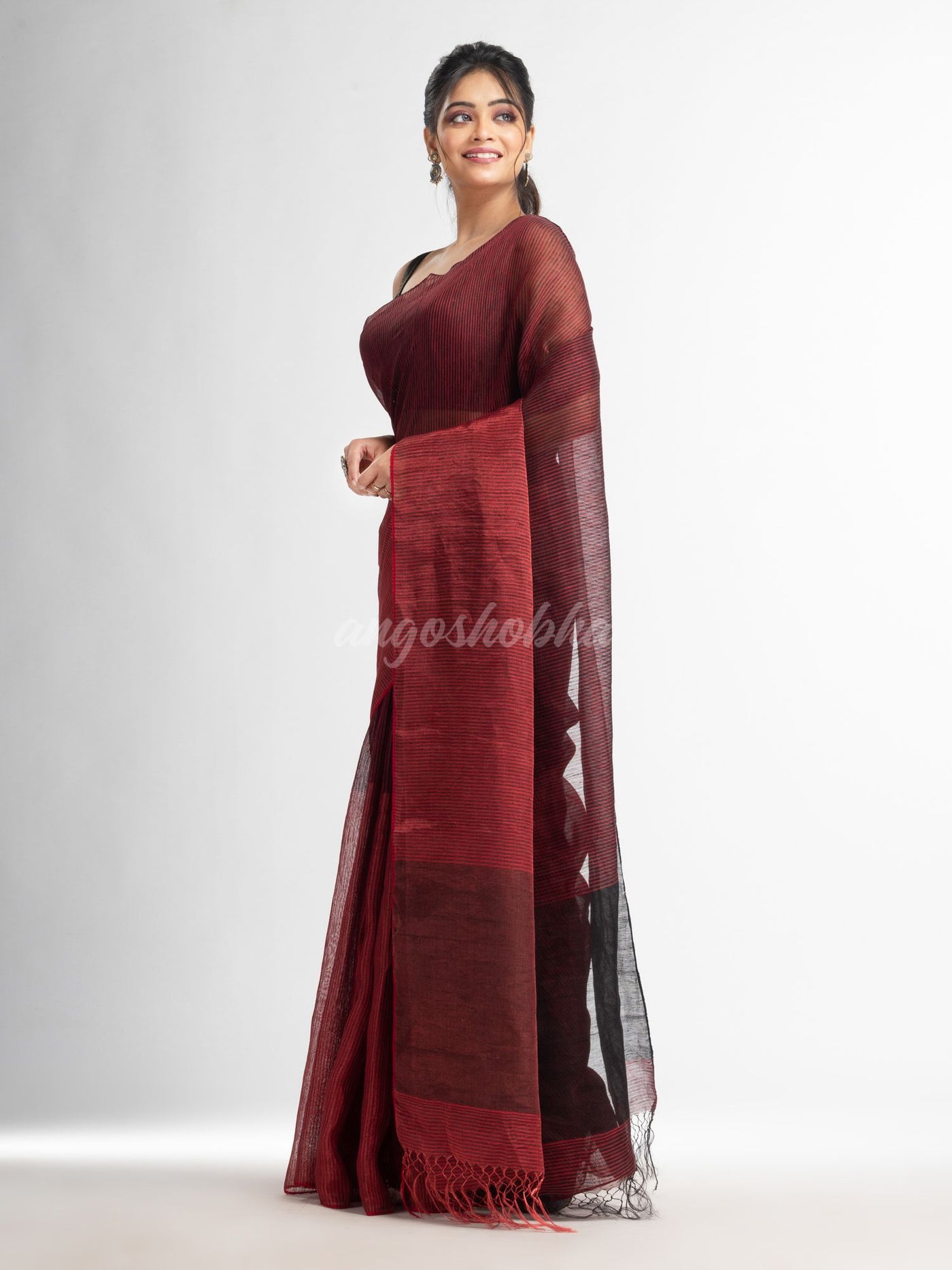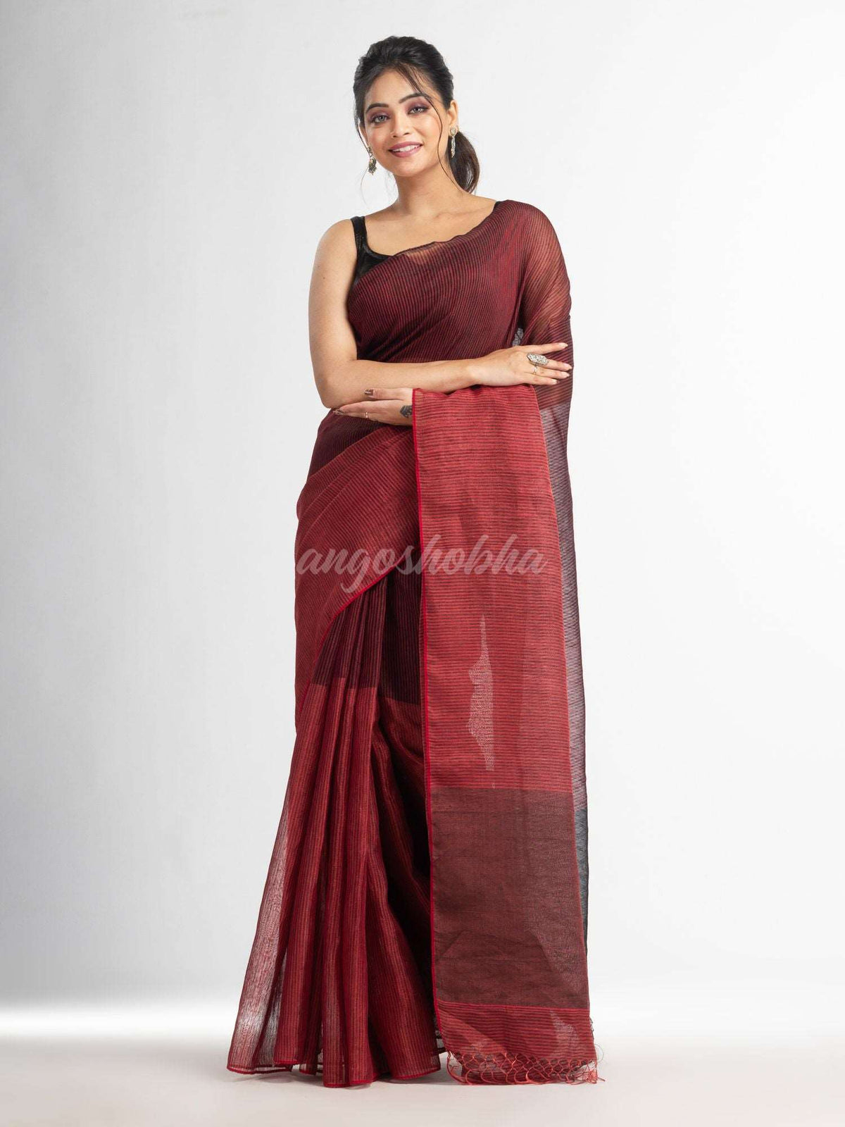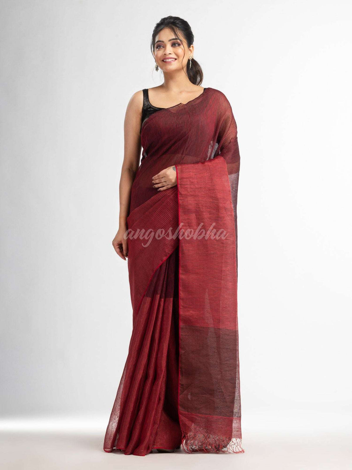 Description: Accentuate your ethnic ensemble by wearing this saree from Angoshobha. Sarees have their own grace, specially this one.This saree from Angoshobha is a beautiful  Traditional Black colour tisssu zari  linen handeoven saree. The saree all body type .with pallu stipe.The saree comes with a running bluse piece Black colour .Style of it with minimal jewellery and high heels to slay the ethnic look.You can wear anywhere and any festival moment with wonderful enjoyment.