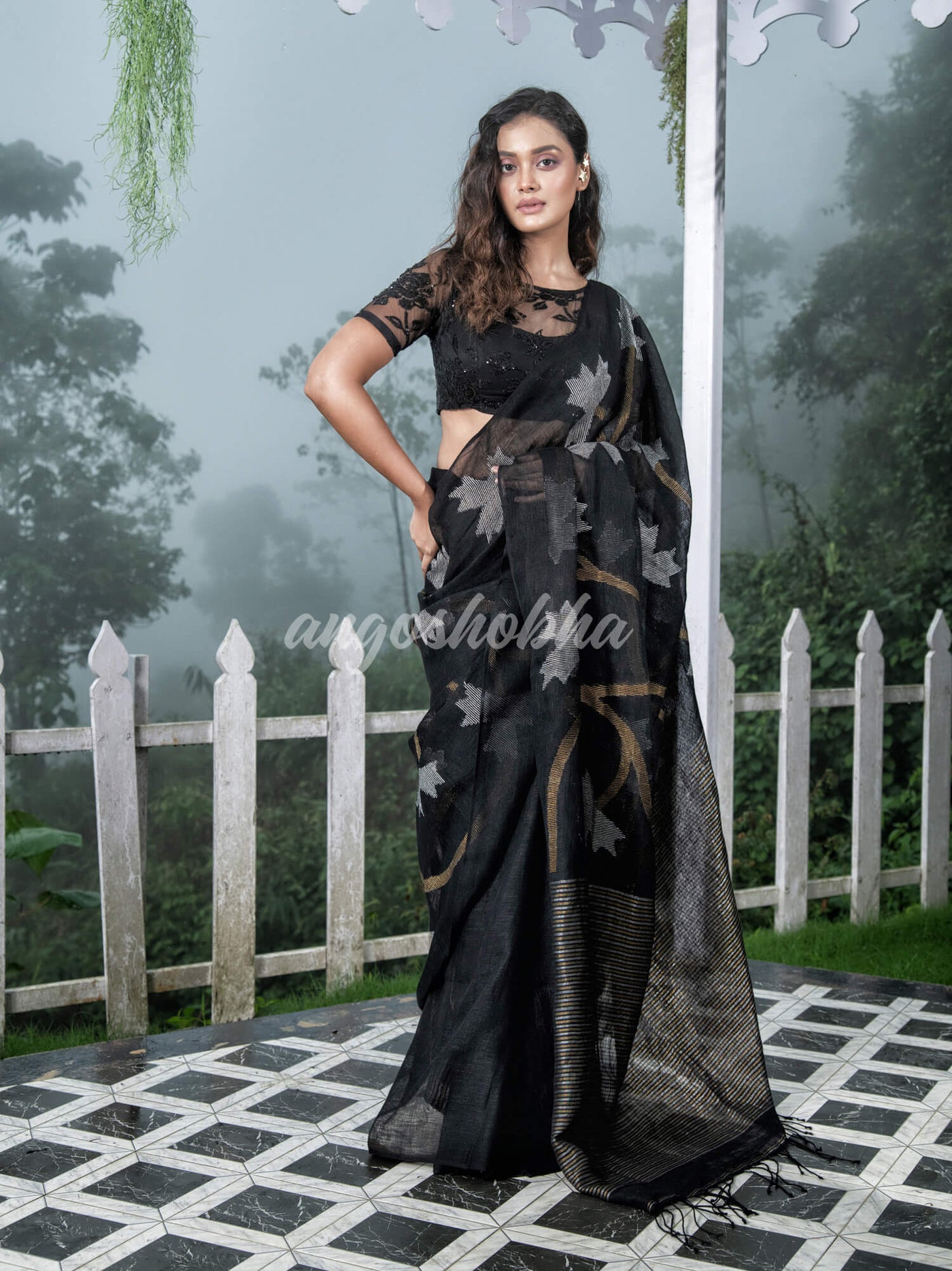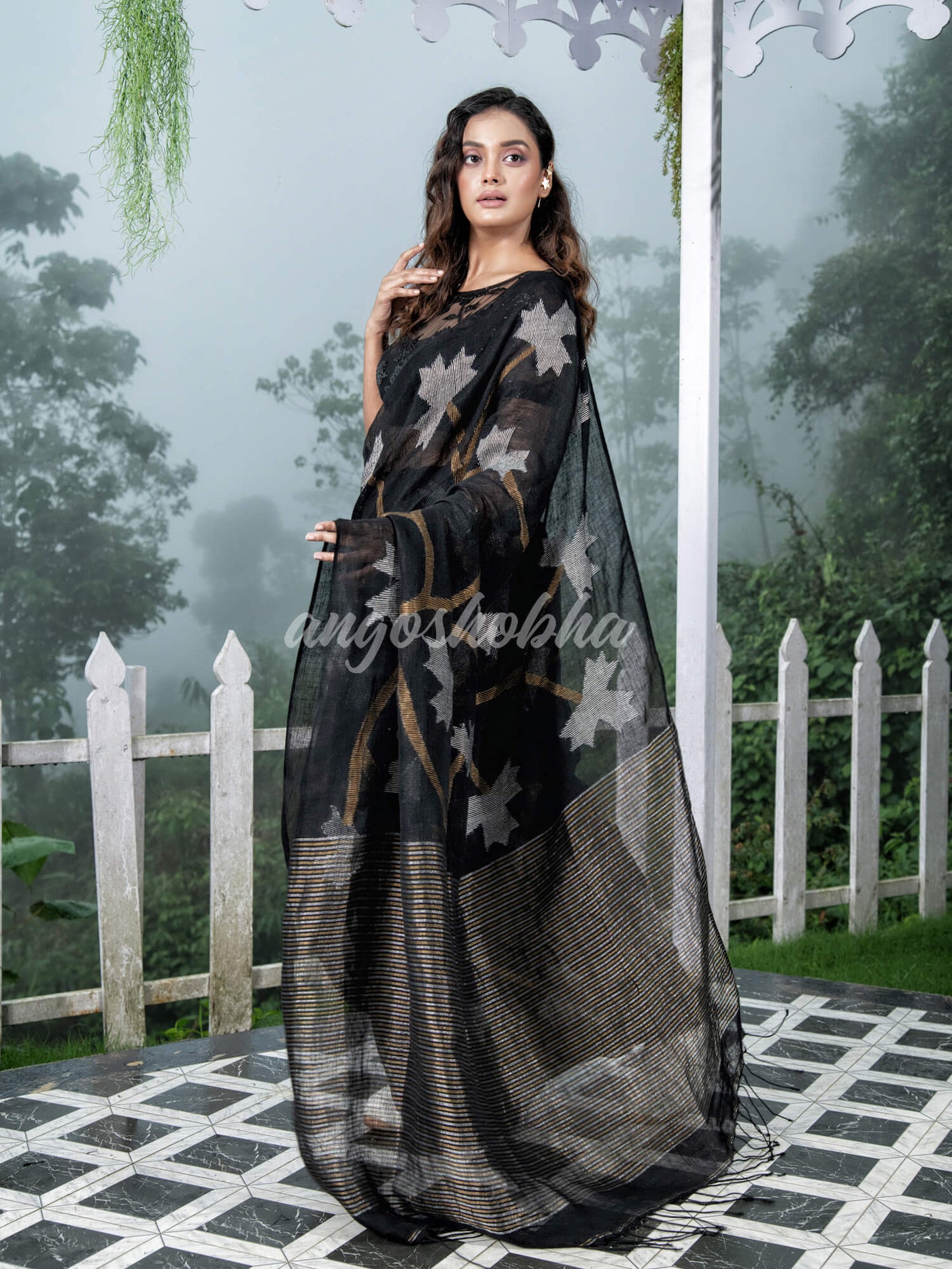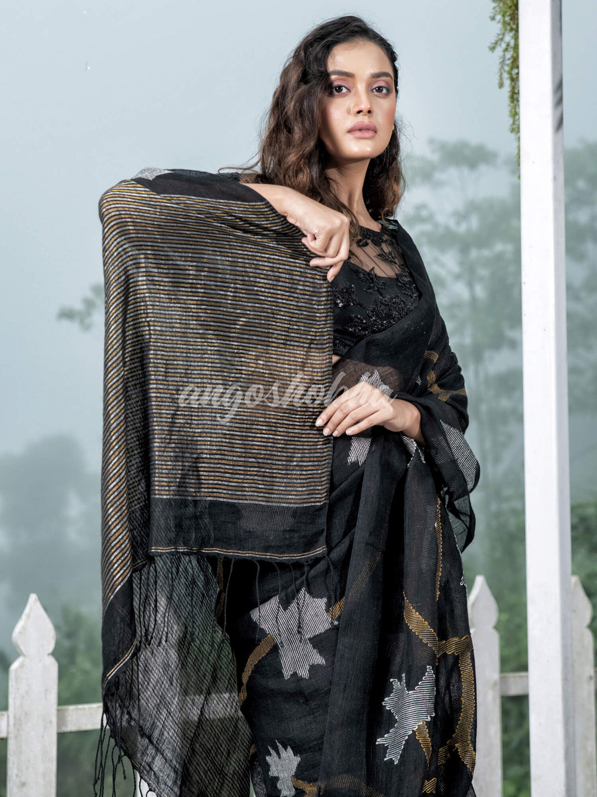 Black Body Synchronised with Jamdani Design Golden & Silver Stripes Pallu Ribbon Border Handwoven Linen Saree