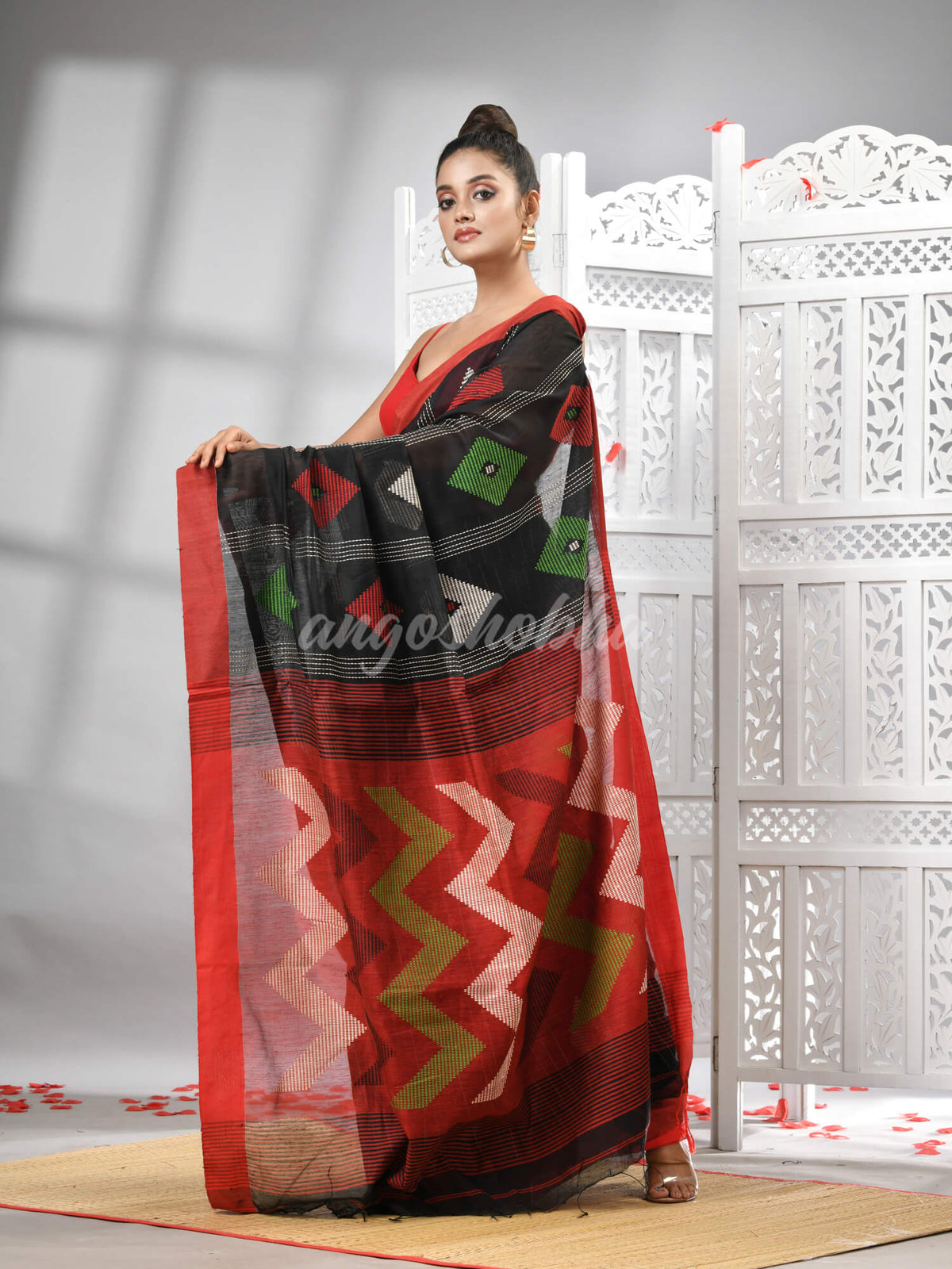 Black Cotton Blend All Body Motive With Red Pallu Handloom Saree