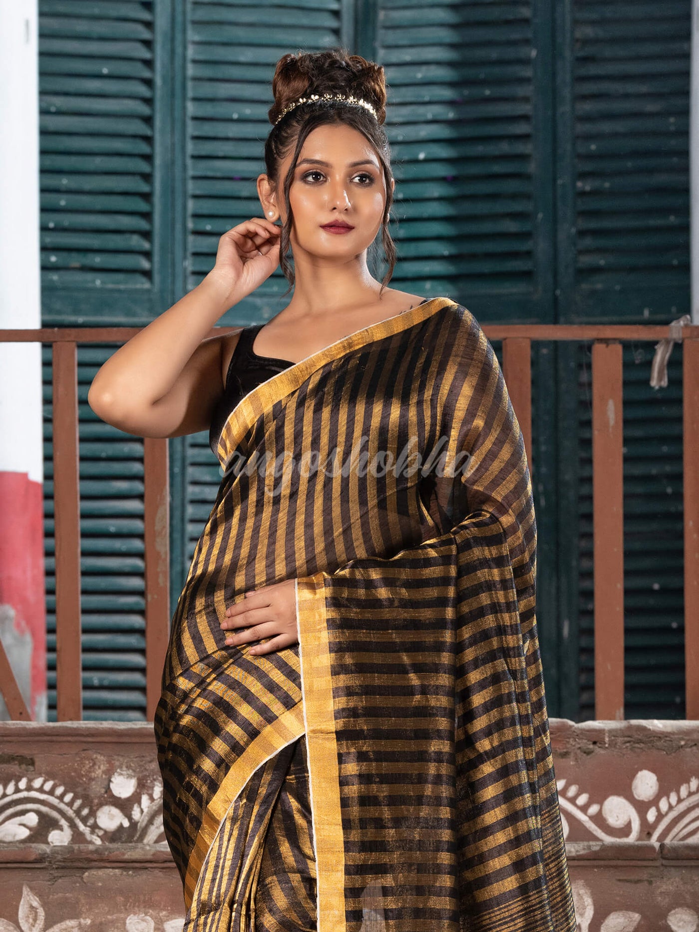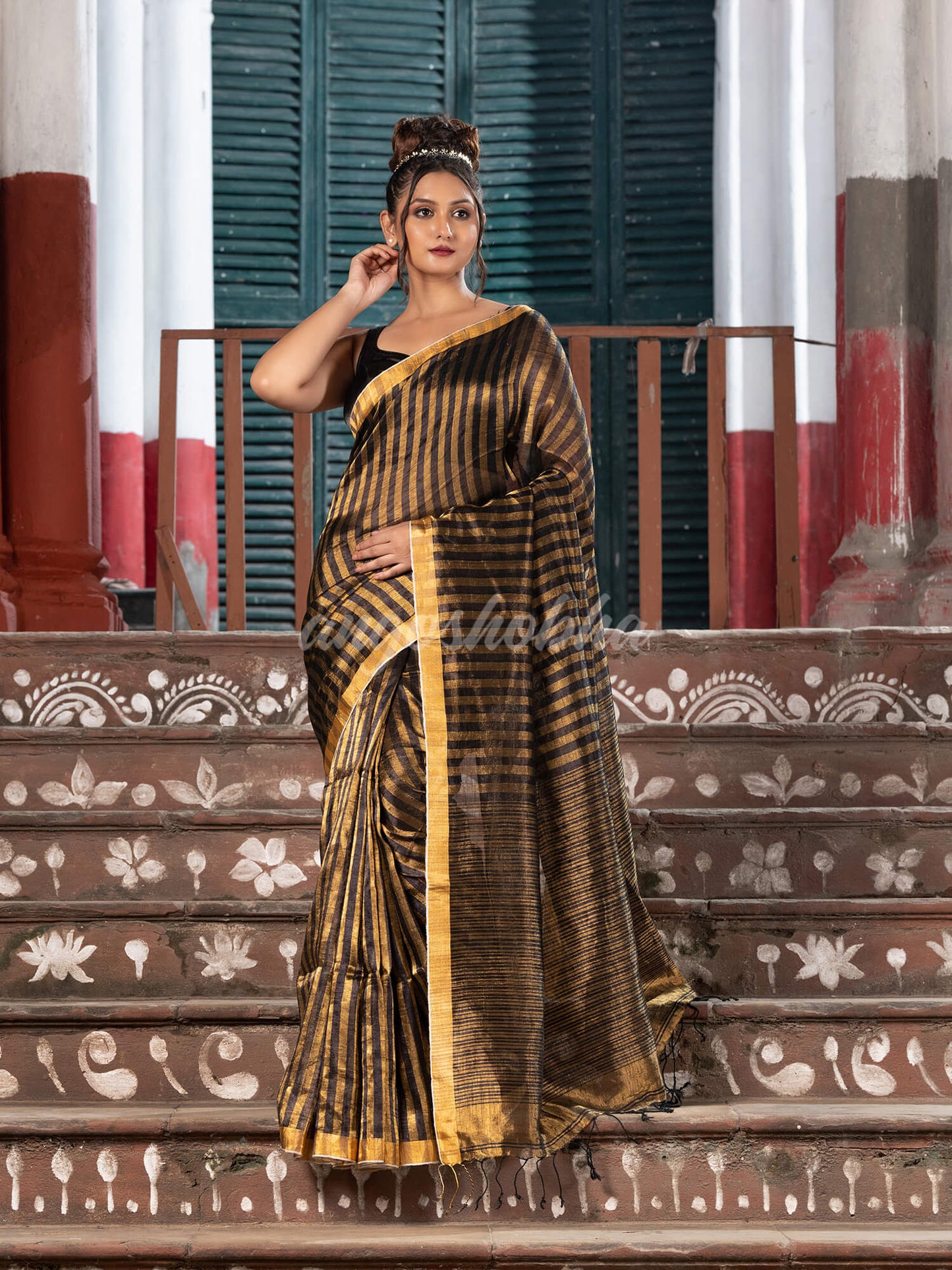 Description: Angoshobha ethnic saree comes with an unstitched blouse piece, which can be stitched according to your taste and preference. This Gold & black saree is crafted by skilled craftsmen using high quality linen zari fabric without compromising on its quality. It has gold border. the saree all body Gold & Black colour  stripes hem.This handloom saree is very comfortable in summer and suitable for festivals .With this beautiful same design pallu., this saree and blouse set will fetch you Oodles of compliments and praises.