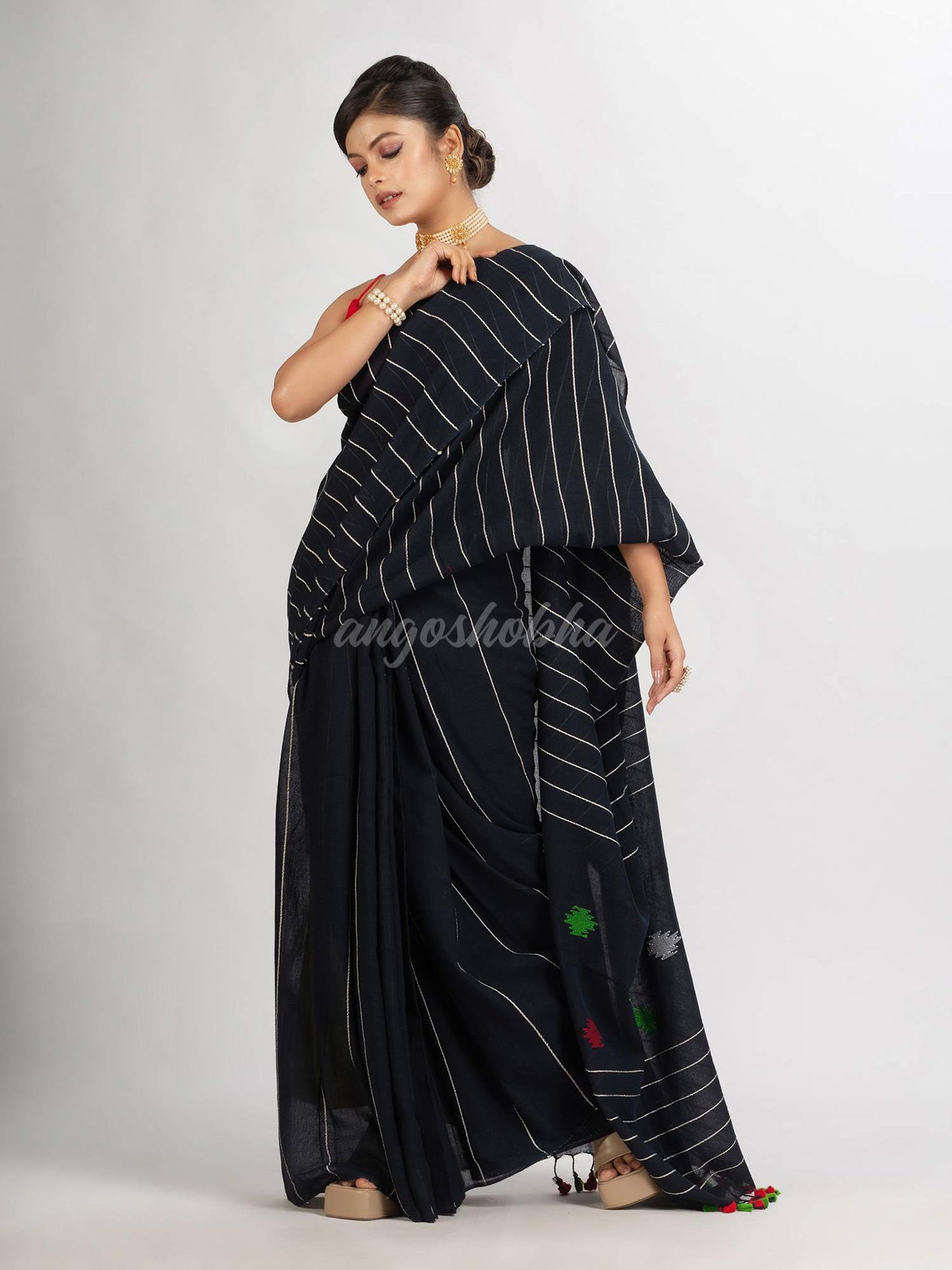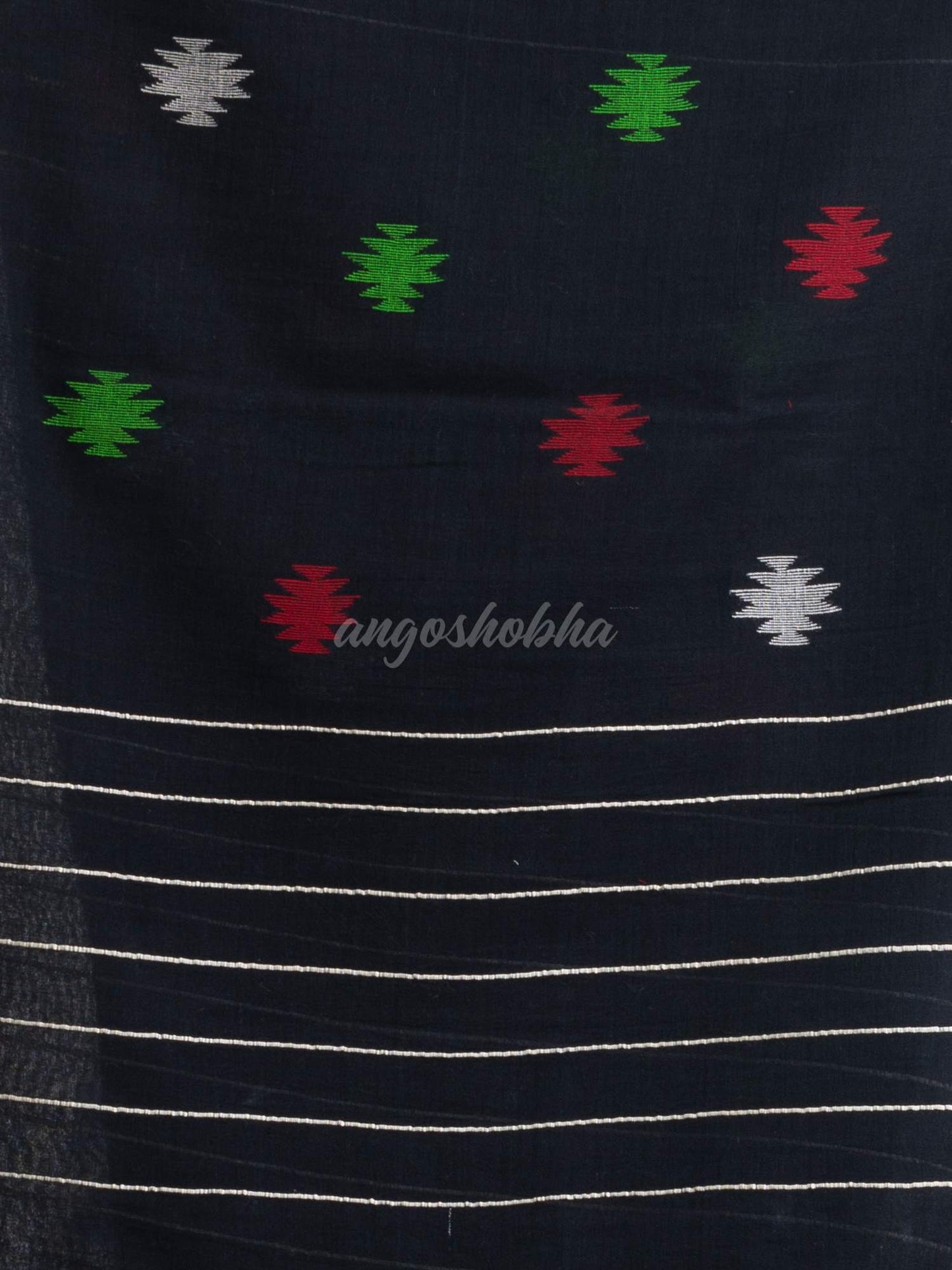 Dscription:  Angoshobha’s ethnic saree comes with an unstitched blouse piece, which can be stitched according to your taste and preference.  This Black cuttun all body White colour stipe with pallu Green ,Rani & White buti jamdani saree is crafted by skilled craftsmen using high qeuality blended cotton fabric without compromising on its quality. Saree is very comfortable in summer and suitable for festivals.