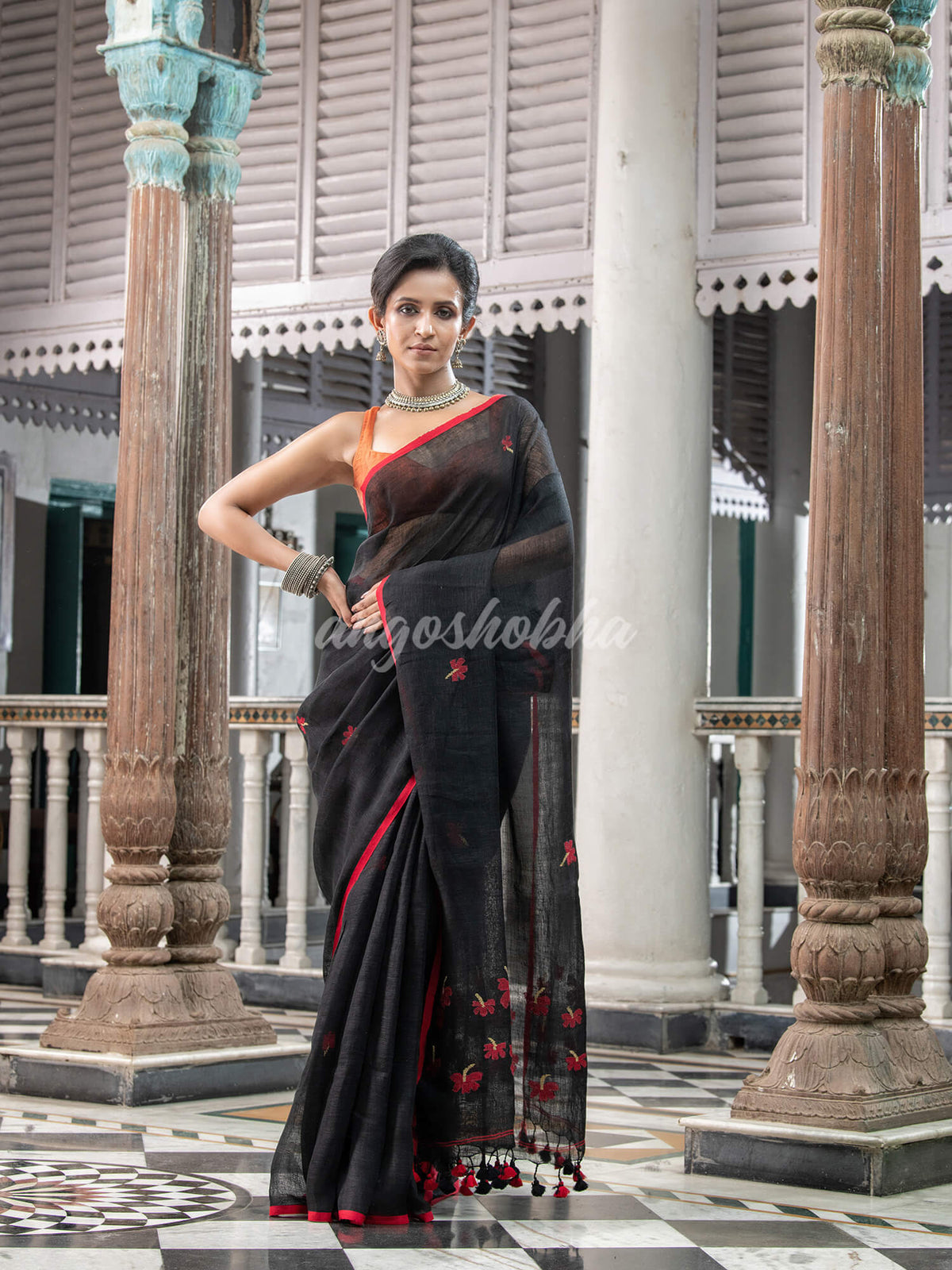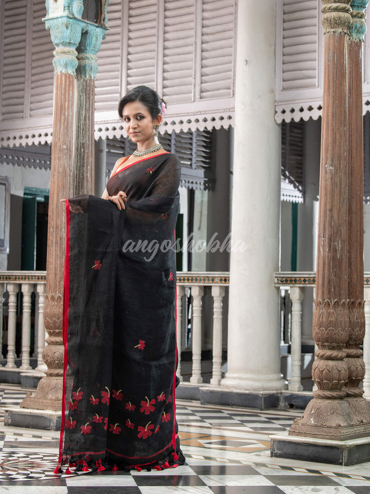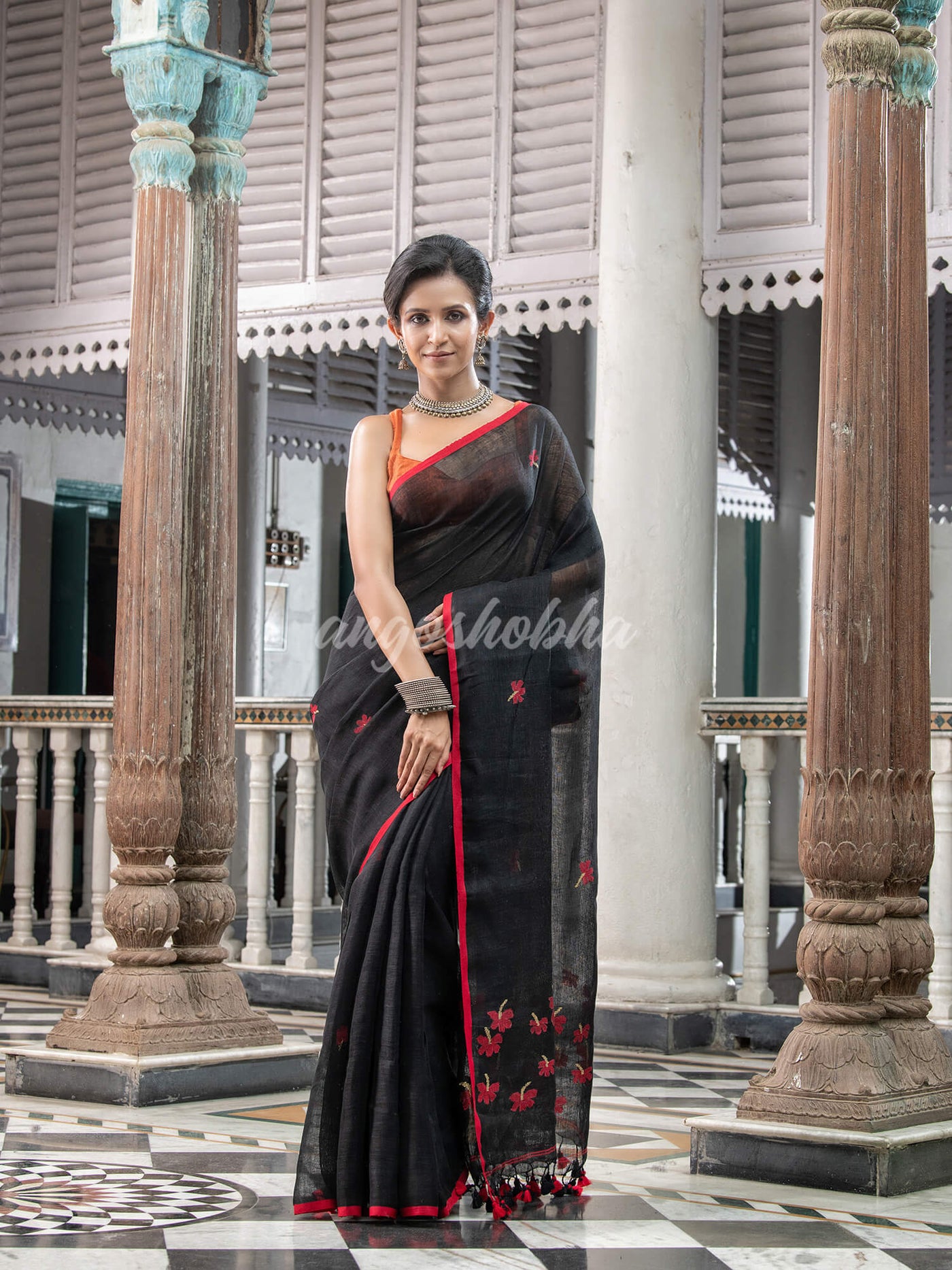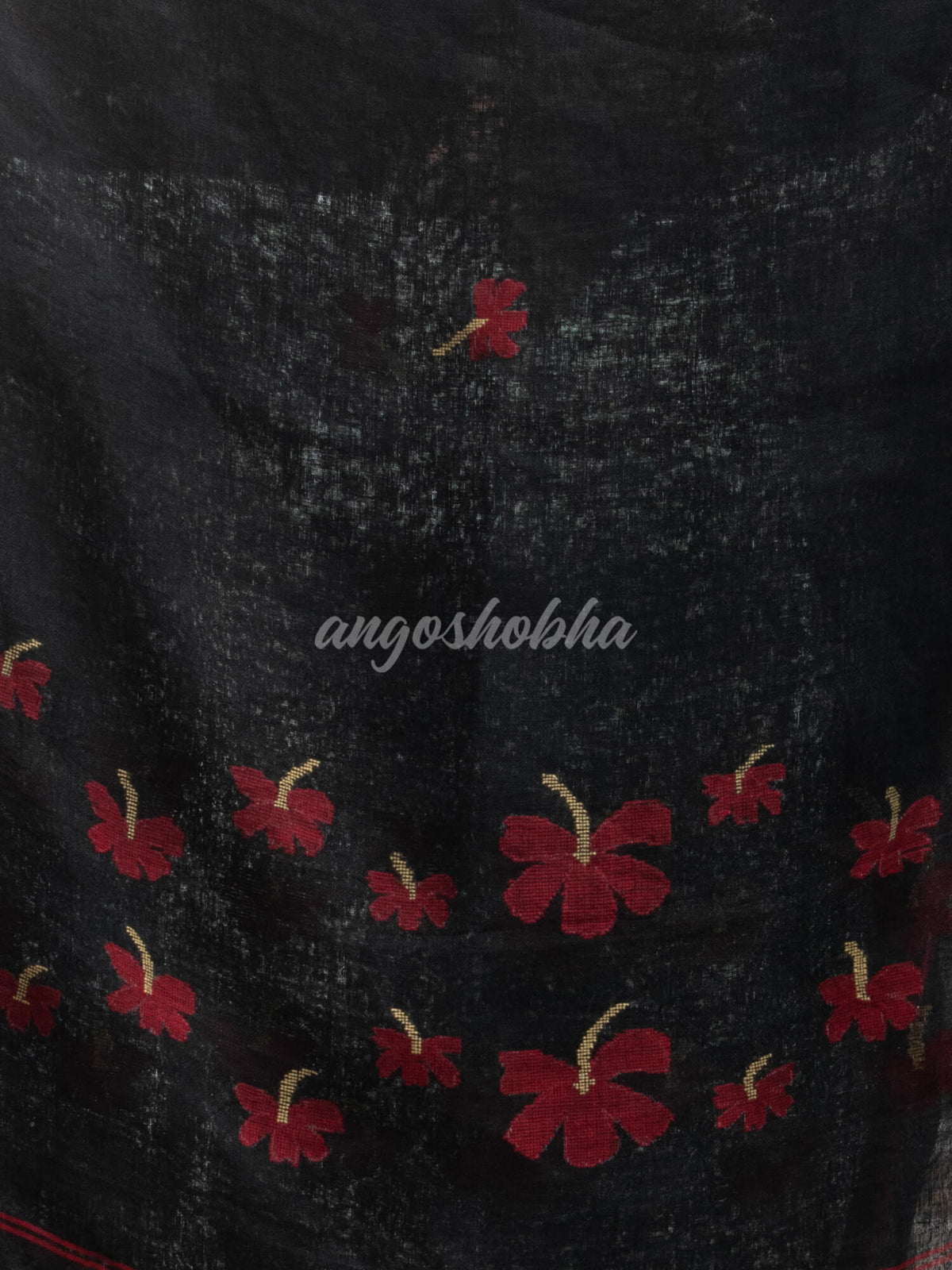 Accentuate your ethnic ensemble by wearing this Pure Black Linen Handloom Saree from Angoshobha. Sarees have their own grace, specially this one. This Handloom Saree from Angoshobha is a beautiful Black Color Linen Handloom Saree. The Saree All Body Flower Motive, With Red Border and Red Color Flower Motive pallu. And Black color blouse piece attached. Crafted in a Linen fabric, this beauty gives the most comfortable fit. Style of it with minimal jewellery and high heels to slay the ethnic look. You can wear anywhere and any festival moment with wonderful enjoyment. So, collect this Pure Black Handloom Saree and enjoy with wearing Linen saree. Obviously, you can trust on this collection. We are always with your fashion and choice. Color hues may slightly vary from that which appears in the image. Minor irregularities are the uniqueness of handlooms and make each piece exquisite.