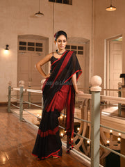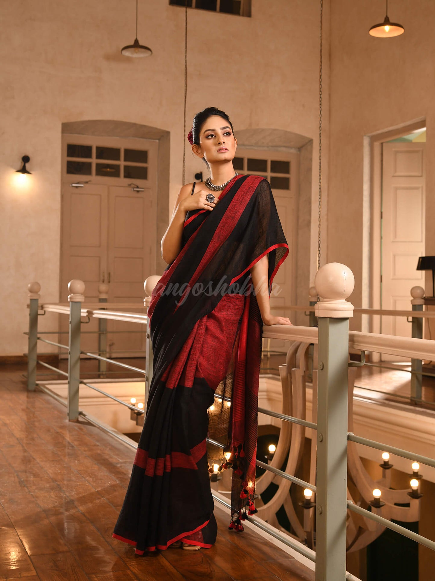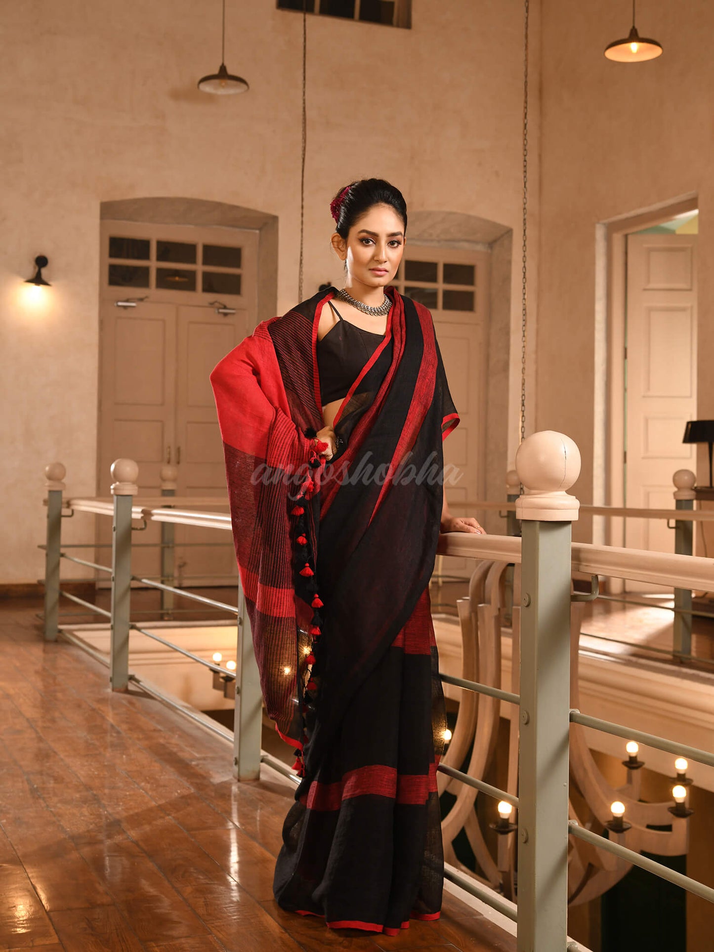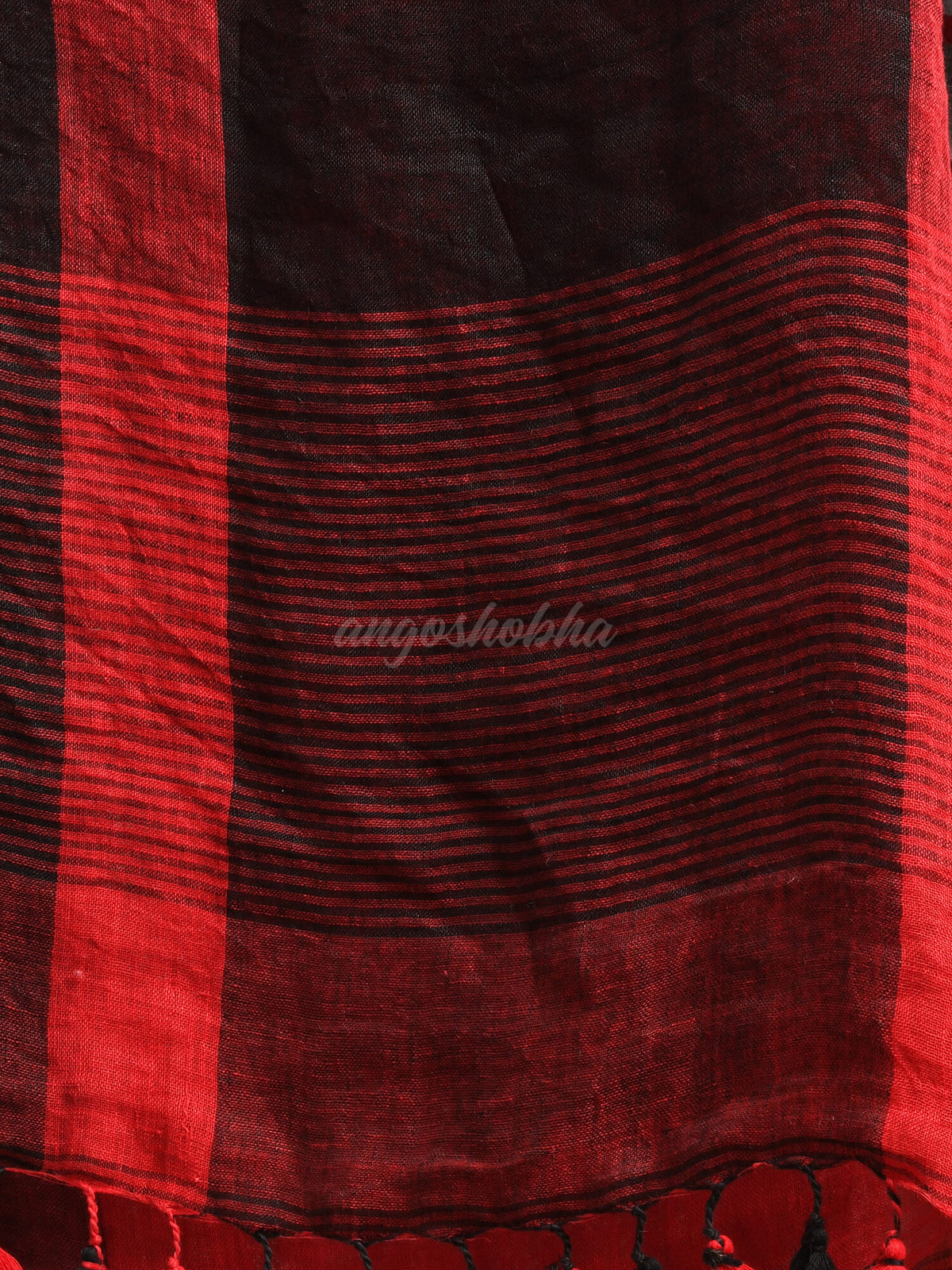 Description: Accentuate your ethnic ensemble by wearing this saree from Angoshobha. Sarees have their own grace, specially this one.This saree from Angoshobha is a beautiful Black colour traditional handwoven  saree. The Saree All Body Red Check. With Red  border,and Same pallu.The saree comes with a Multi colour running blouse piece.And Black ,Red Colour PomPom Attached. .So collect this product and enjoy with wearing Linen saree. Obviously you can trust on this collection. We are always with your fashion and choice.