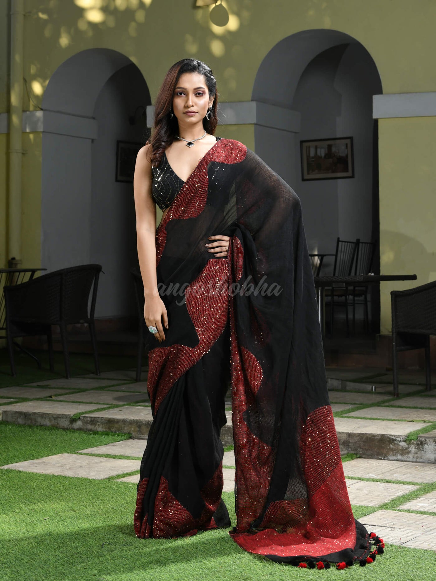 Description: Angoshobha’s ethnic saree comes with an unstitched blouse piece, which can be stitched according to your taste and preference. This red color sequins saree is crafted by skilled craftsmen using high quality linen fabric without compromising on its quality. The border of the sari is disguised with Black color and the hem of the sari is concocted Black and red color. Saree is very comfortable in summer and suitable for festivals .With this beautiful design and fabric, this saree and blouse set will fetch you Oodles of compliments and praises.