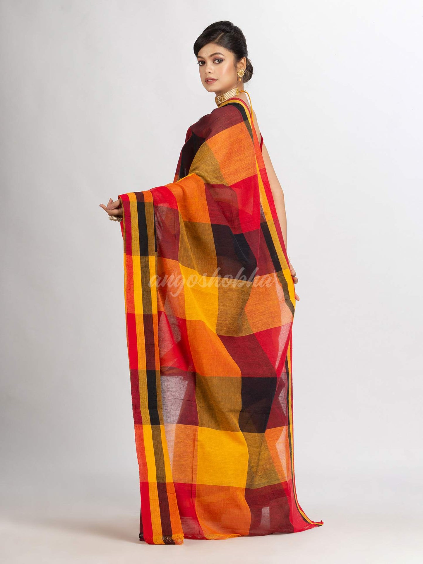 DESCRIPTION: The sari of the Angoshobha is one of the best product.It is manufactured with cotton fabric. It is a beautiful Multi colour check handloom cotton saree .The border of the sari is disguised with Red colour.The hem of the sari is disguised with multi colour and an attached blouse piece.