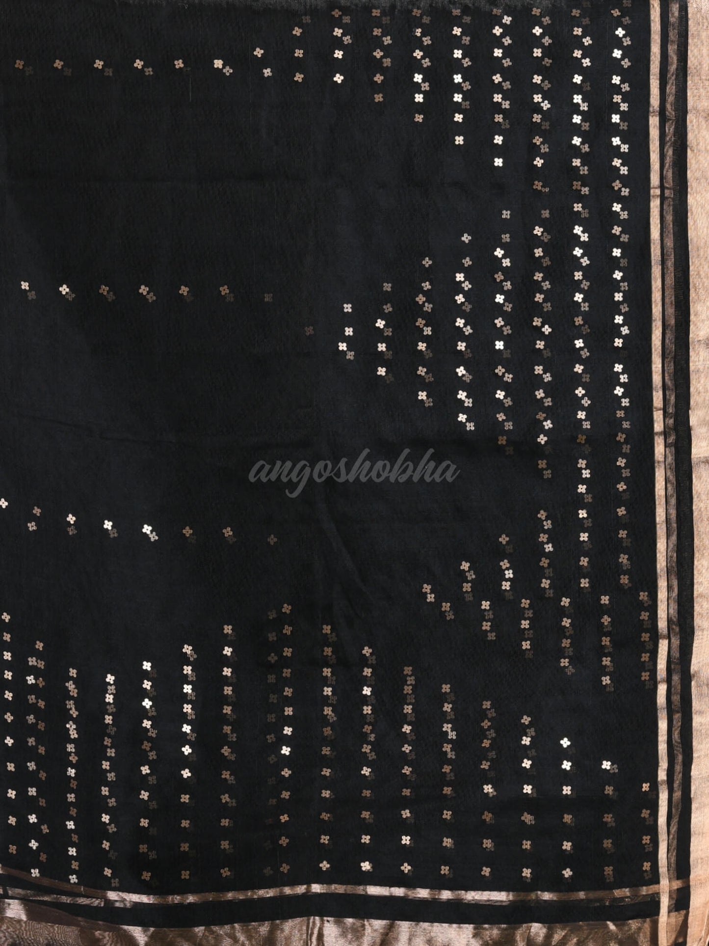 Description: Accentuate your ethnic ensemble by wearing this saree from Angoshobha. Sarees have their own grace, specially this one. This saree from Angoshobha is a beautiful Black Colour Silk Handwoven Muslin Saree. TheAll Saree Sequence Work .With zari Border ,And Working The sequence Temple design Along The Border Side of The saree.With Same pallu. Black colour blouse piece attached. Crafted in a Silk fabric, this beauty gives the most comfortable fit. Style of it with minimal jewellery and high heels to slay the ethnic look.You can wear anywhere and any festival moment with wonderful enjoyment.So collect this product and enjoy with wearing silk saree. Obviously you can trust on this collection. We are always with your fashion and choice.