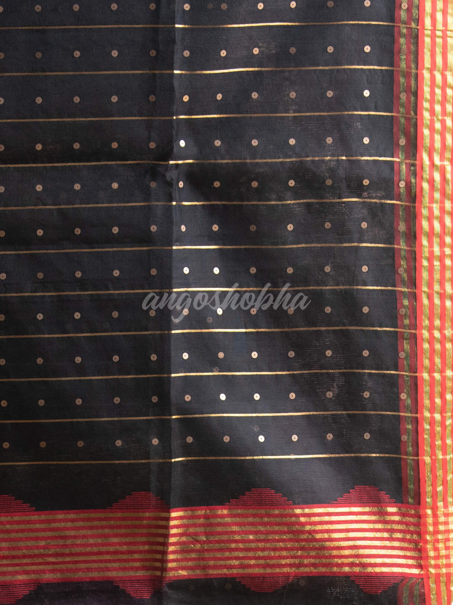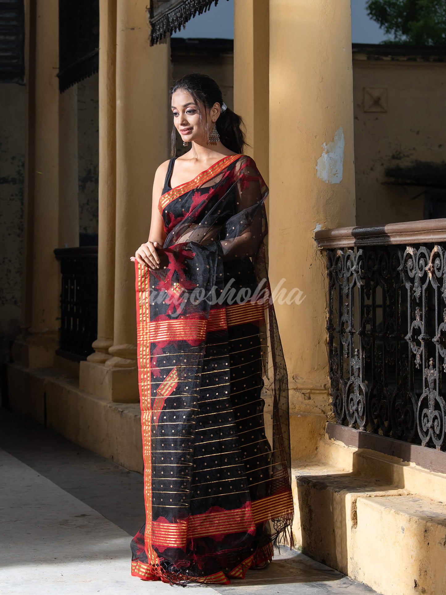 Description : Accentuate your ethnic ensemble by wearing this saree from Angoshobha. Sarees have their own grace, specially this one. This saree from Angoshobha is a beautiful Black colour handloom art silk saree. the saree all body red colour jacquard work and sequence, .with multi colour border. it is strip and sequence pallu. The saree comes with black colour running blouse piece. this beauty gives the most comfortable fit. Style it with minimal jewellery and high heels to slay the ethnic look.Colour hues may slightly vary from that which appears in the image