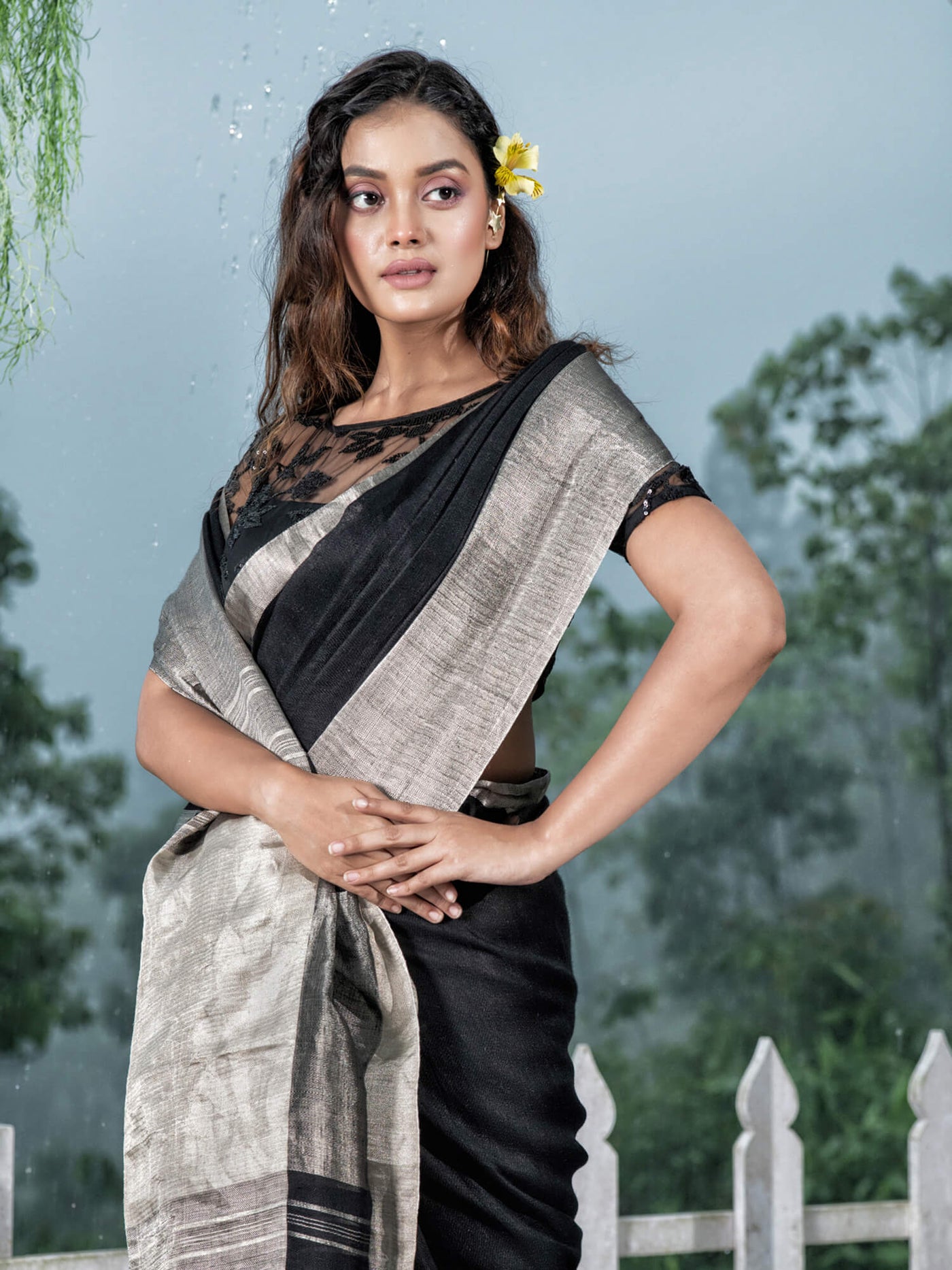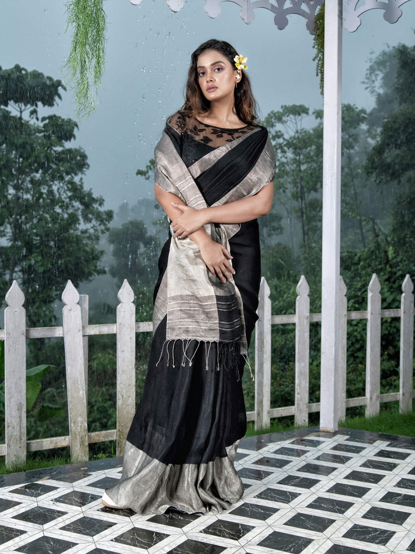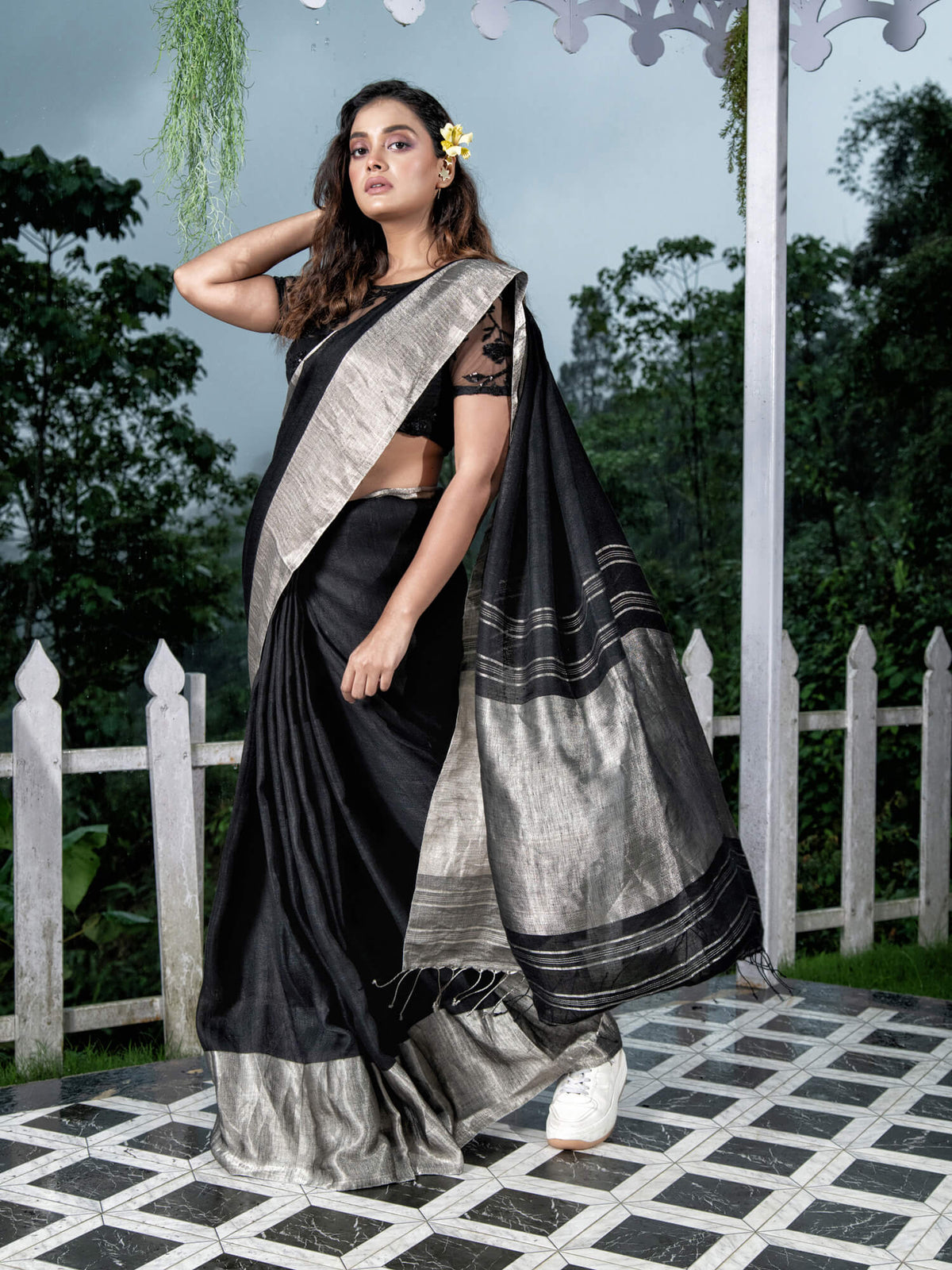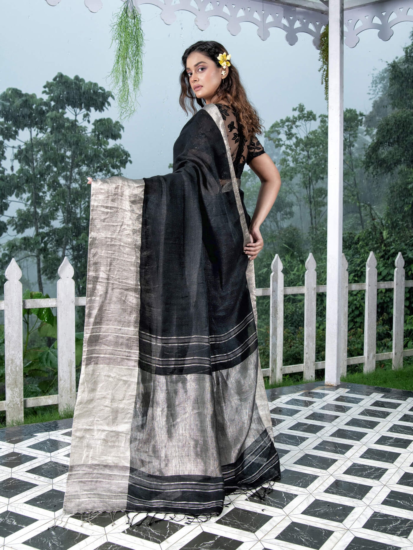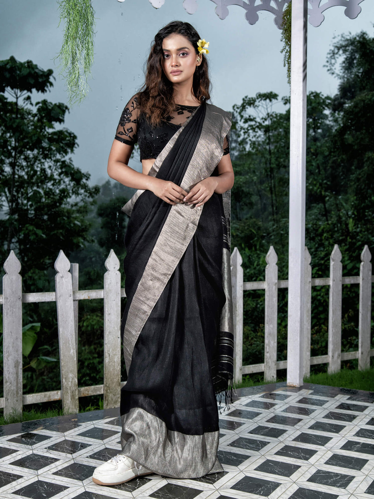 Description:  Black Traditional Handloom Linen Saree is the best in comfort which is suitable for Indian climatic condition. Linen add another value in durability and comfort ,one can easily carry this Saree in all occasion and in case of formal wear. The body is concocted with black color soft linen fabrics. The hem of the saree is fascinated with the plain silver zari on the middle and both side of the pallu is designed by the check silver color stitched with the patching plain tassels . The border of the saree is made with wide silver zari that glows the saree brightly .Organic textured of the Saree makes it a sheer piece of class. It has a running blouse piece with black color. Wear this Saree for any occasion and you are sure to make heads turn around.