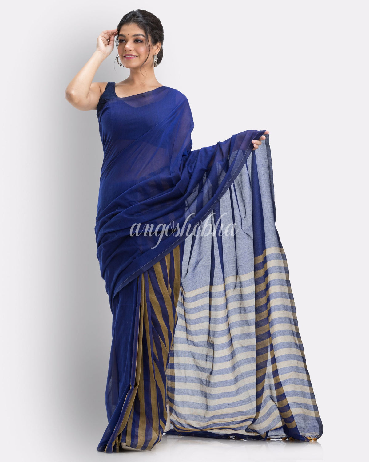 Description: Accentuate your ethnic ensemble by wearing this mulmul saree from Angoshobha. Sarees have their own grace, specially this one.This saree from Angoshobha is a beautiful blue handloom saree with handwoven work.It comes with a vibrant blue and beige pallu and an attached blouse piece.Crafted in a soft cotton fabric, this beauty gives the most comfortable fit. Style it with minimal jewellery and high heels to slay the ethnic look.You can wear anywhere and any festival moment with wonderful enjoyment.So collect this product and enjoy with wearing cotton saree.Obviously you can trust on this collection.