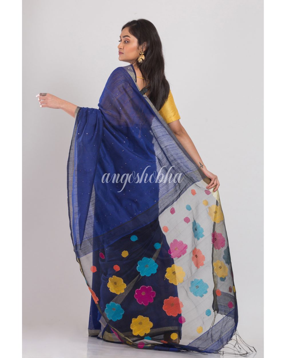 Description: Woven with elegance and grace, this saree from Angoshobha is the epitome of beauty. It is a Blue colored handloom cotton blended saree with sequins all over and Jamdani work on the pallu. It is with multi color flower designed hem with an attached blouse piece.Border is silver base.Style it with minimal jewellery and a potli bag for a gorgeous look.So buy this item very soon.