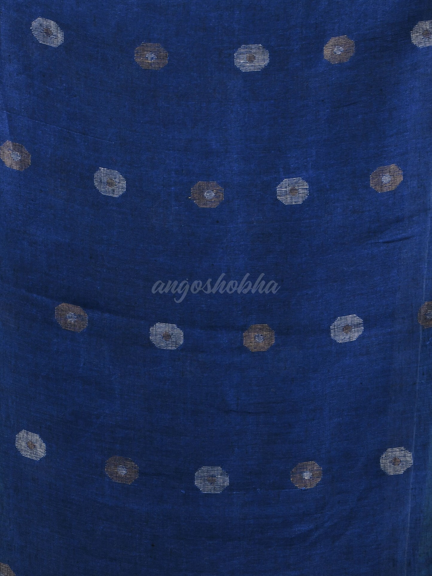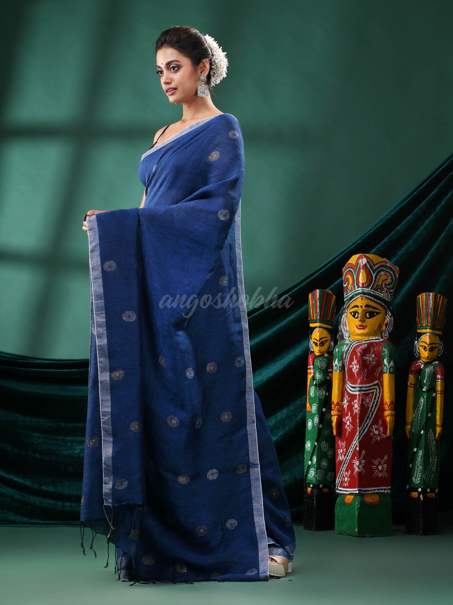 Description: Accentuate your ethnic ensemble by wearing this saree from Angoshobha. Sarees have their own grace, specially this one.This saree from Angoshobha is a beautiful Blue Handloom Linen saree.The all body ball motifs. ,border of the sari is disguised with silver zari colour .The hem of the sari is disguised with blouse piece.Crafted in a linen fabric, this beauty gives the most comfortable fit.You can wear anywhere and any festival moment with wonderful enjoyment.Color hues may slightly vary from that which appears in the image