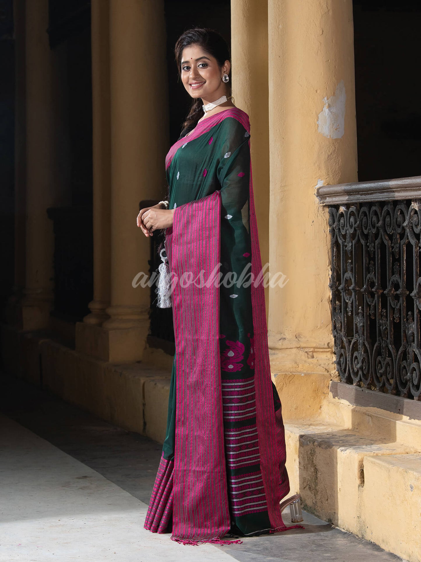 Description: Accentuate your ethnic ensemble by wearing this saree from Angoshobha. Sarees have their own grace, specially this one. This saree from Angoshobha is a beautiful Bottle green cotton jamdani saree . The saree all body motif .with mahapar added strip border.with jacquard work kolka design in pallu. and attach Bottle Green colour blouse piece. Crafted in a cotton fabric, this beauty gives the most comfortable fit. Style of it with minimal jewellery and high heels to slay the ethnic look. You can wear anywhere and any festival moment with wonderful enjoyment. So collect this product and enjoy with wearing cotton saree. Obviously you can trust on this collection. We are always with your fashion and choice.