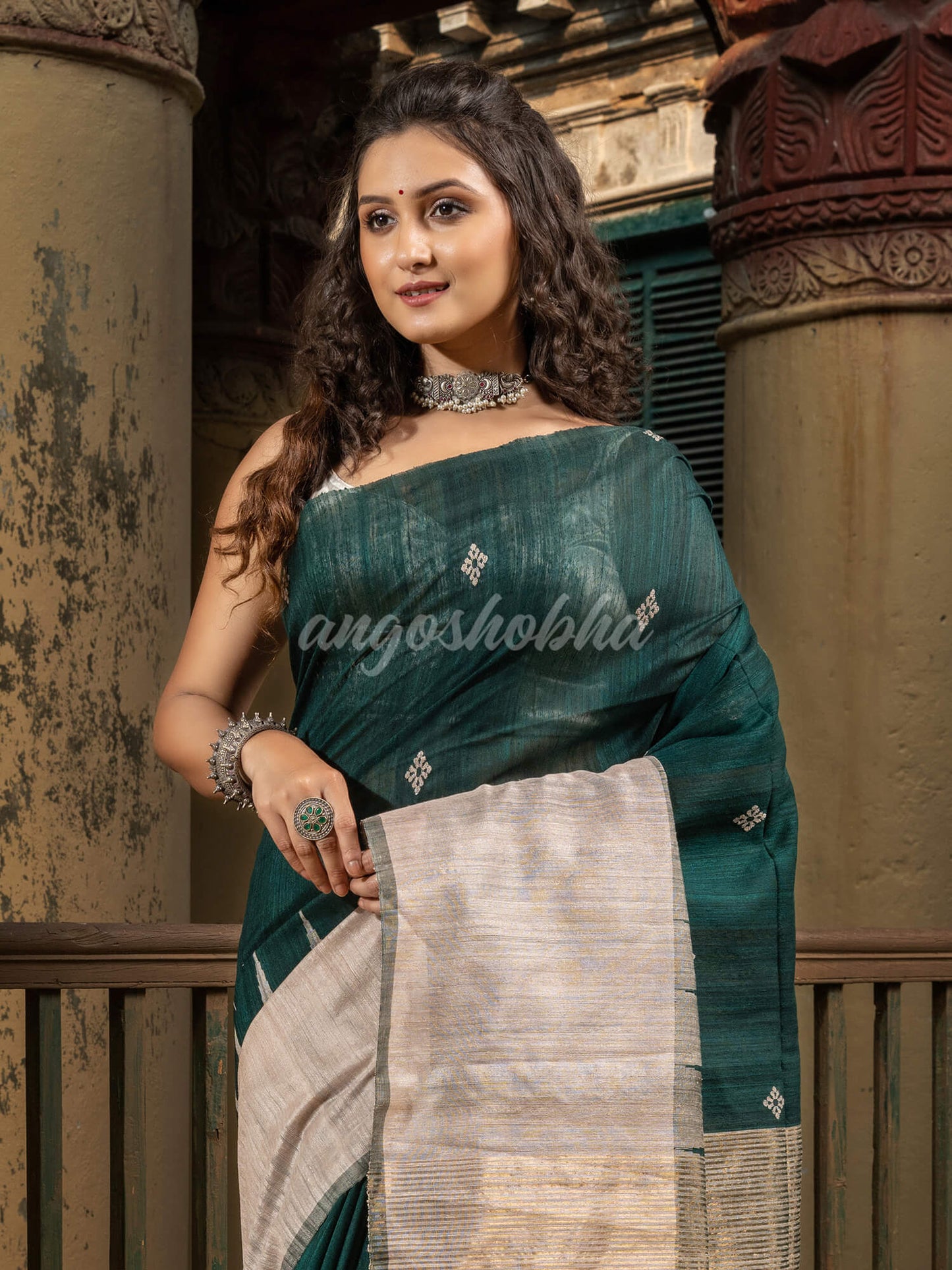 Description: Accentuate your ethnic ensemble by wearing this saree from Angoshobha. Sarees have their own grace, specially this one.This saree from Angoshobha is a beautifu bottle Green colour jacquqrd silk matka saree. The all saree muga colour small jacquard motif. with muga colour mahapar border.A par temple border of body. and pallu strip and jacquard flower motif. The saree comes with a bottle green colour running blouse piece. You can wear any festival moment with wonderful enjoyment. so collect this product and enjoy with werring silk matka saree.