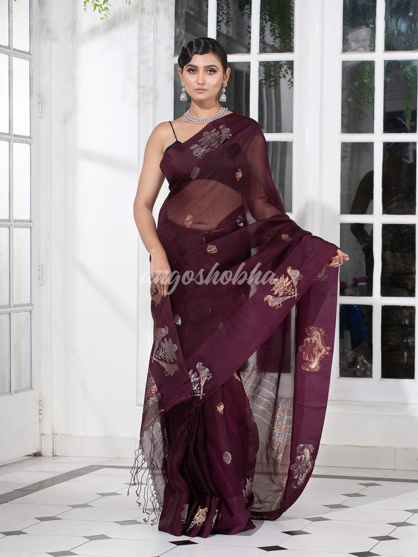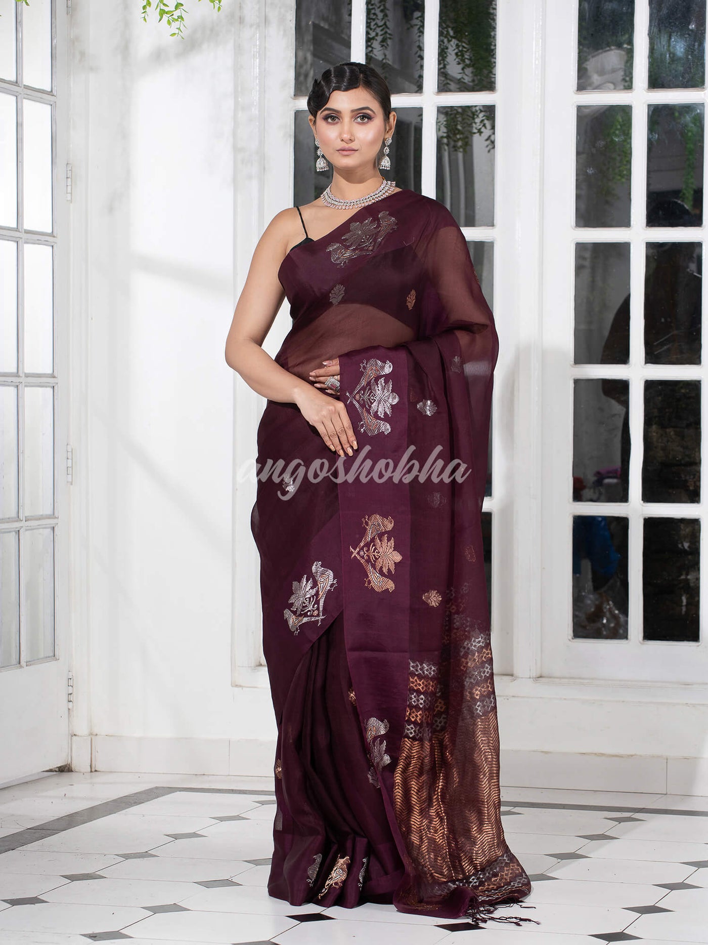 Boysenberry Pure Muslin Intricate Bird Design Border Handwoven Saree