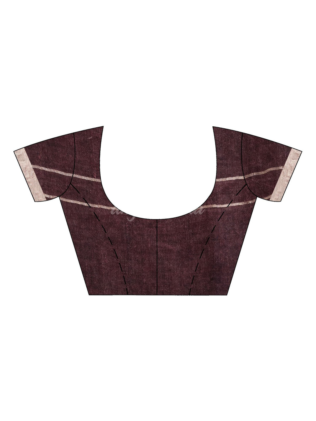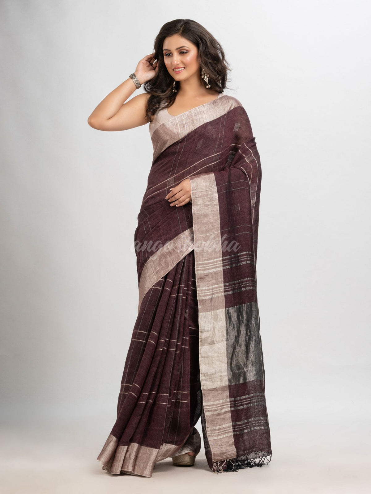 Description: Accentuate your ethnic ensemble by wearing this saree from Angoshobha. Sarees have their own grace, specially this one. This saree from Angoshobha is a beautiful Brown coffee colour jamdani saree. All body of the saree is silver zarie colour check,and motive. with silver zari colour border.with pallu silver zarie colour stripe & check .The saree  comes with a Brown coffee colour blouse piece.Crafted in a linen fabric, this beauty gives the most comfortable fit. Style of it with minimal jewellery and high heels to slay the ethnic look.You can wear anywhere and any festival moment with wonderful enjoyment.