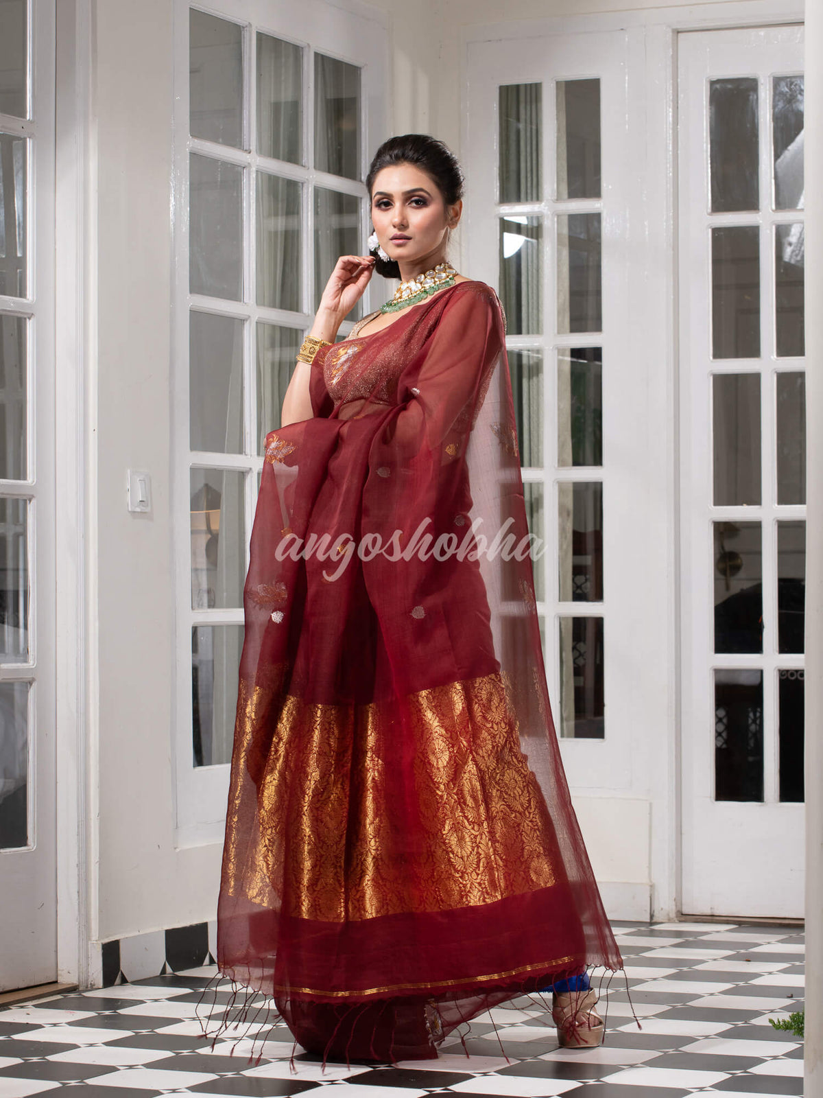 Burgundy Pure Muslin Silk Leaf Motifs Textured Handwoven Saree