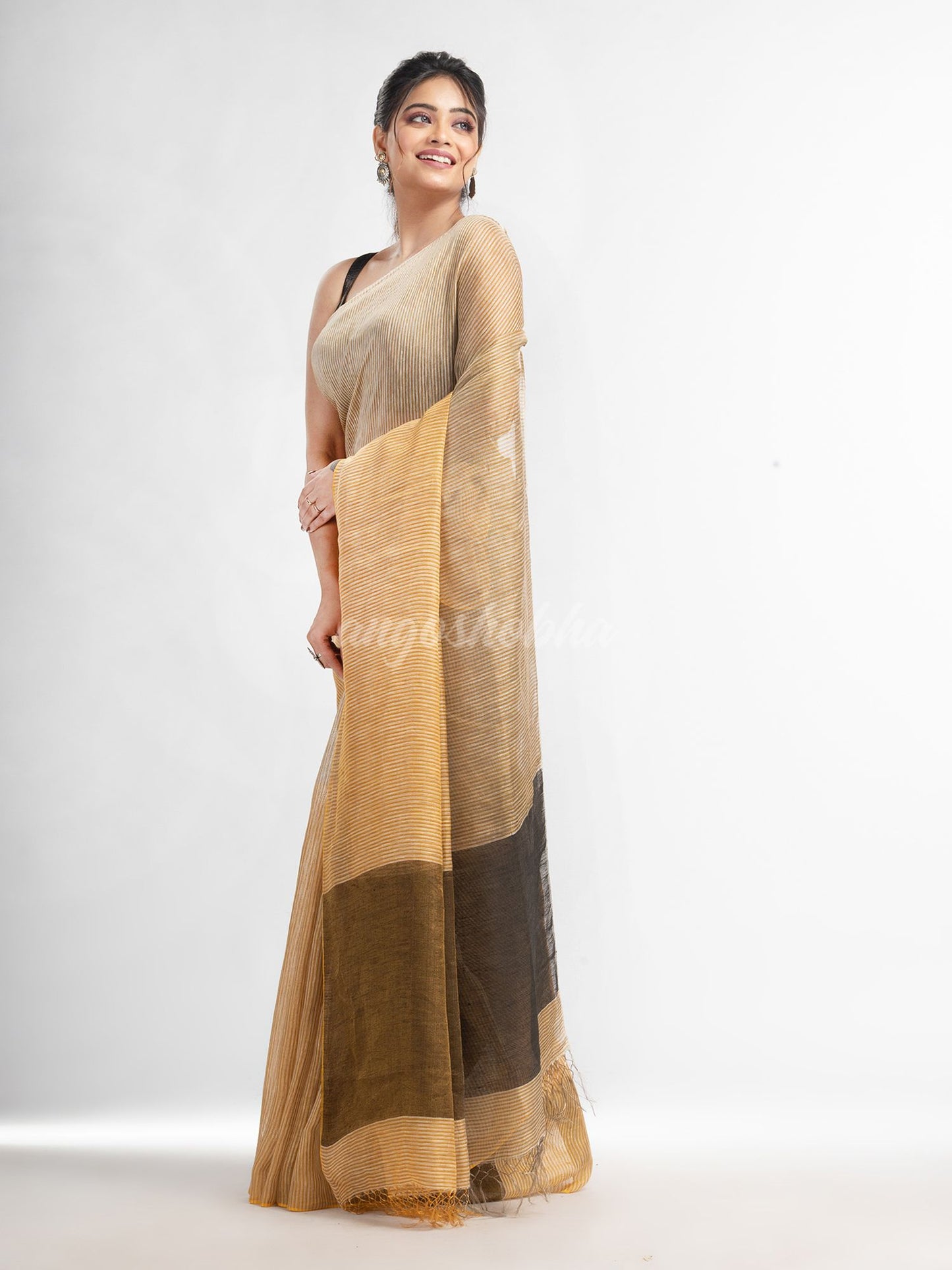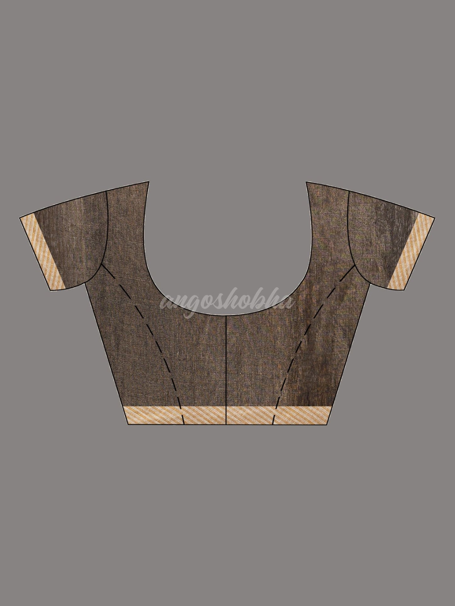 Description: Accentuate your ethnic ensemble by wearing this saree from Angoshobha. Sarees have their own grace, specially this one.This saree from Angoshobha is a beautiful  Traditional Cream colour tisssu zari  linen handeoven saree. The saree all body type .with pallu stipe.The saree comes with a running bluse piece Black colour .Style of it with minimal jewellery and high heels to slay the ethnic look.You can wear anywhere and any festival moment with wonderful enjoyment.