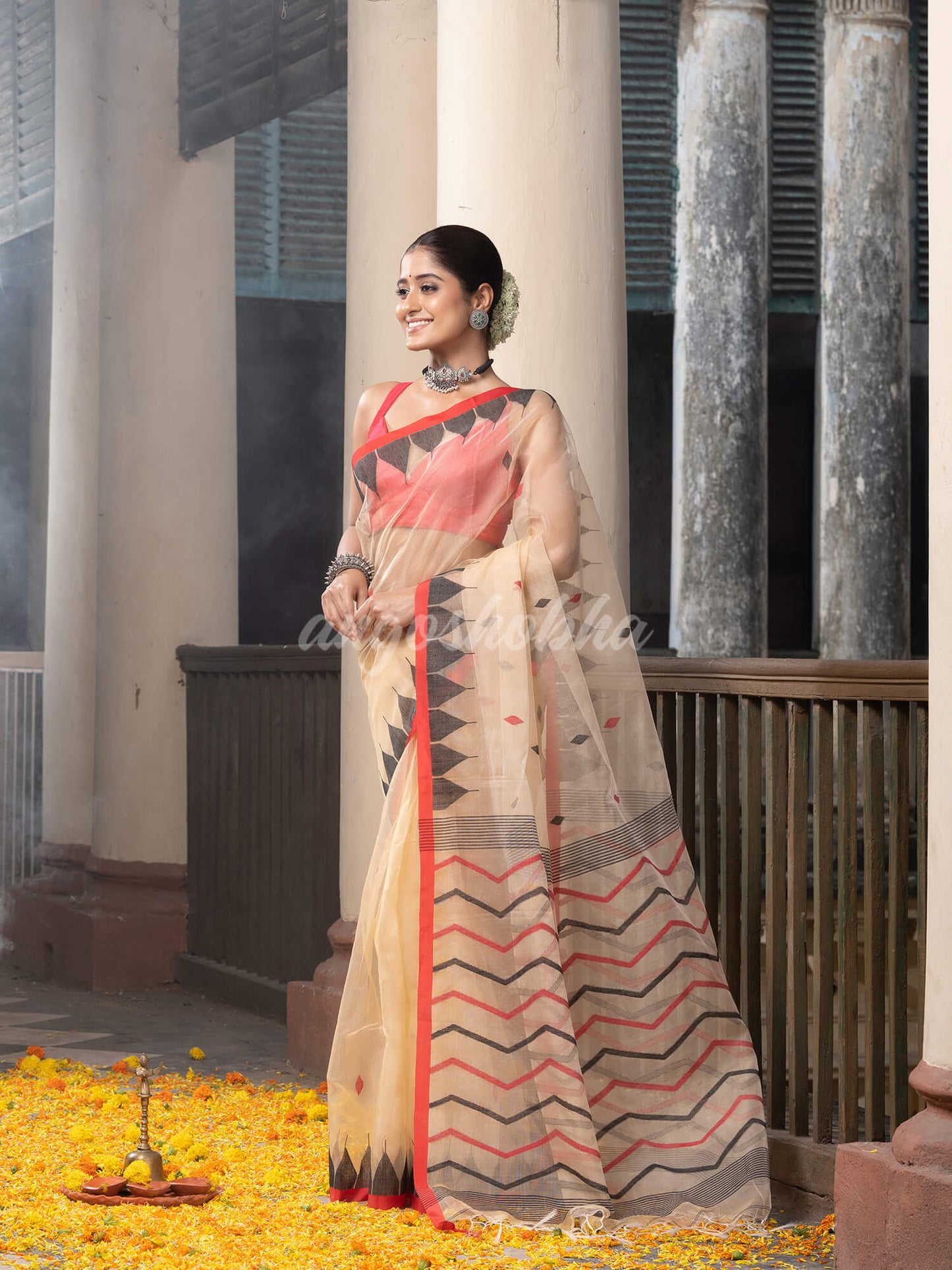 Description: Accentuate your ethnic ensemble by wearing this saree from Angoshobha. Sarees have their own grace, specially this one.This saree from Angoshobha is a beautiful cream colour jamdani Art Silk saree. The saree all body Motive. with Red & Black colour temple border.and pallu Jacquard design The saree comes with a Cream colour running blouse piece. You can wear any festival moment with wonderful enjoyment. so collect this product and enjoy with werring Art Silk saree.