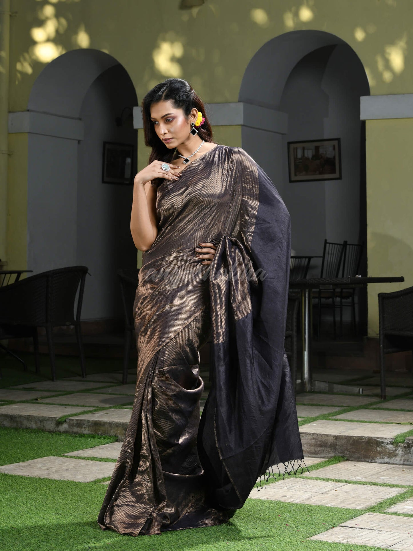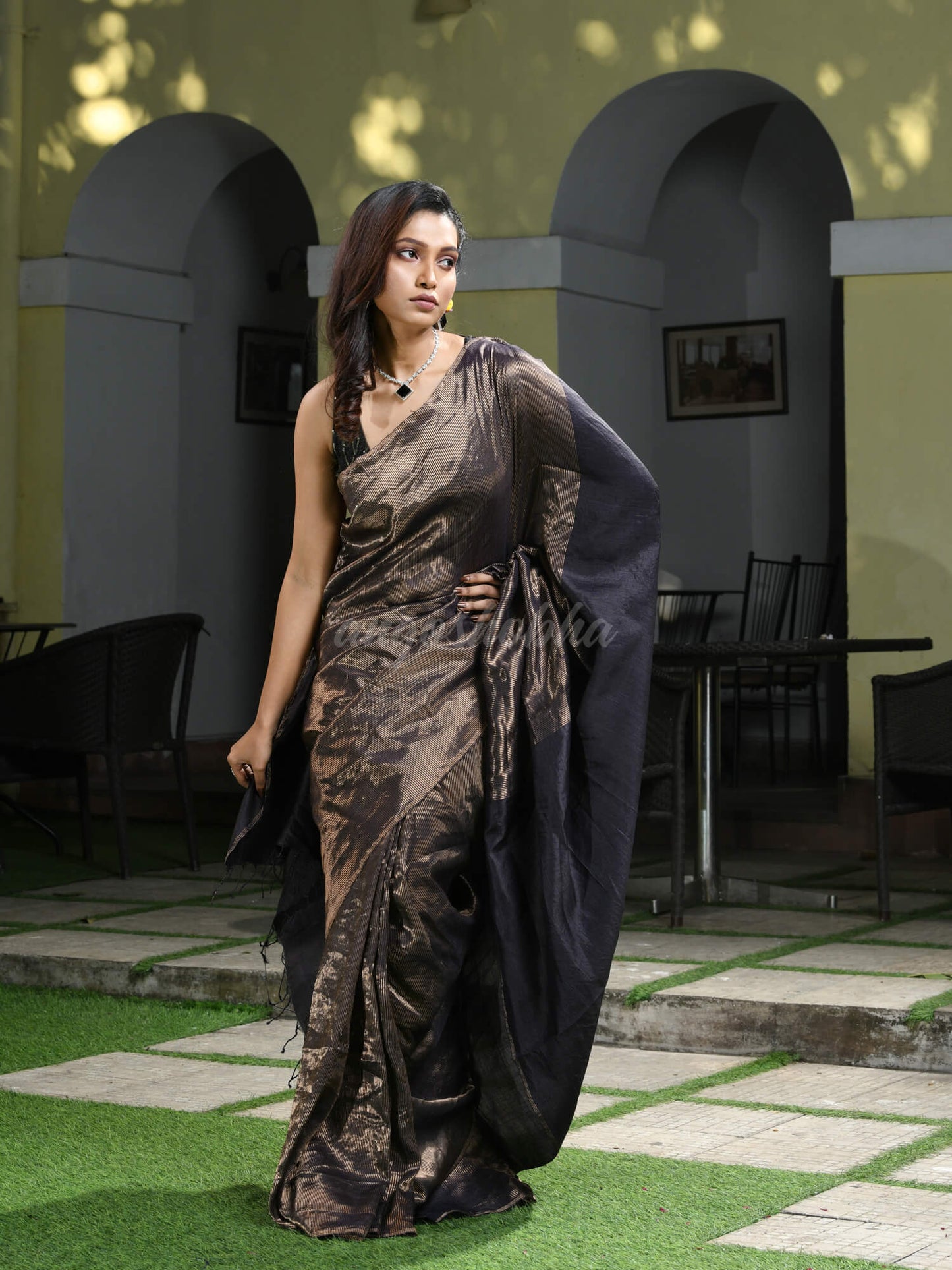 Description: Accentuate your ethnic ensemble by wearing this saree from Angoshobha. Sarees have their own grace, specially this one. This saree from Angoshobha is a beautifu Dark chocolate Colour Tussar Handwoven Saree. The Saree All Body Zari check. With Self Border. And Solid pallu. And Dark Chocolate colour blouse piece attached. Crafted in a Tussar Zari fabric, this beauty gives the most comfortable fit. Style of it with minimal jewellery and high heels to slay the ethnic look.You can wear anywhere and any festival moment with wonderful enjoyment.So collect this product and enjoy with wearing Tussar Zari saree. Obviously you can trust on this collection. We are always with your fashion and choice.