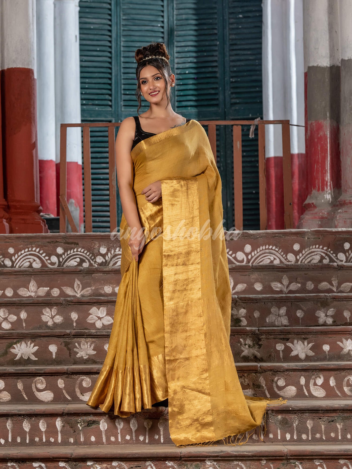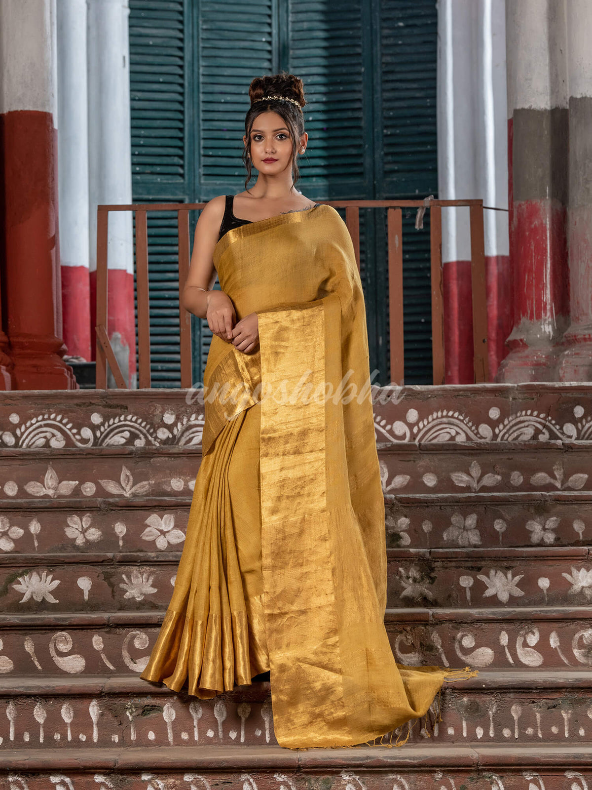 Description: Accentuate your ethnic ensemble by wearing this saree from Angoshobha. Sarees have their own grace, specially this one.This saree from Angoshobha is a beautiful Gold handloom saree with textured linen work all over.The border of the sari is disguised with golden zari color.The hem of the sari is disguised with gold and golden combination attached with blouse piece.Crafted in a linen fabric, this beauty gives the most comfortable fit. Style of it with minimal jewellery and high heels to slay the ethnic look.You can wear anywhere and any festival moment with wonderful enjoyment.So collect this product and enjoy with wearing linen saree. Obviously you can trust on this collection. We are always with your fashion and choice.