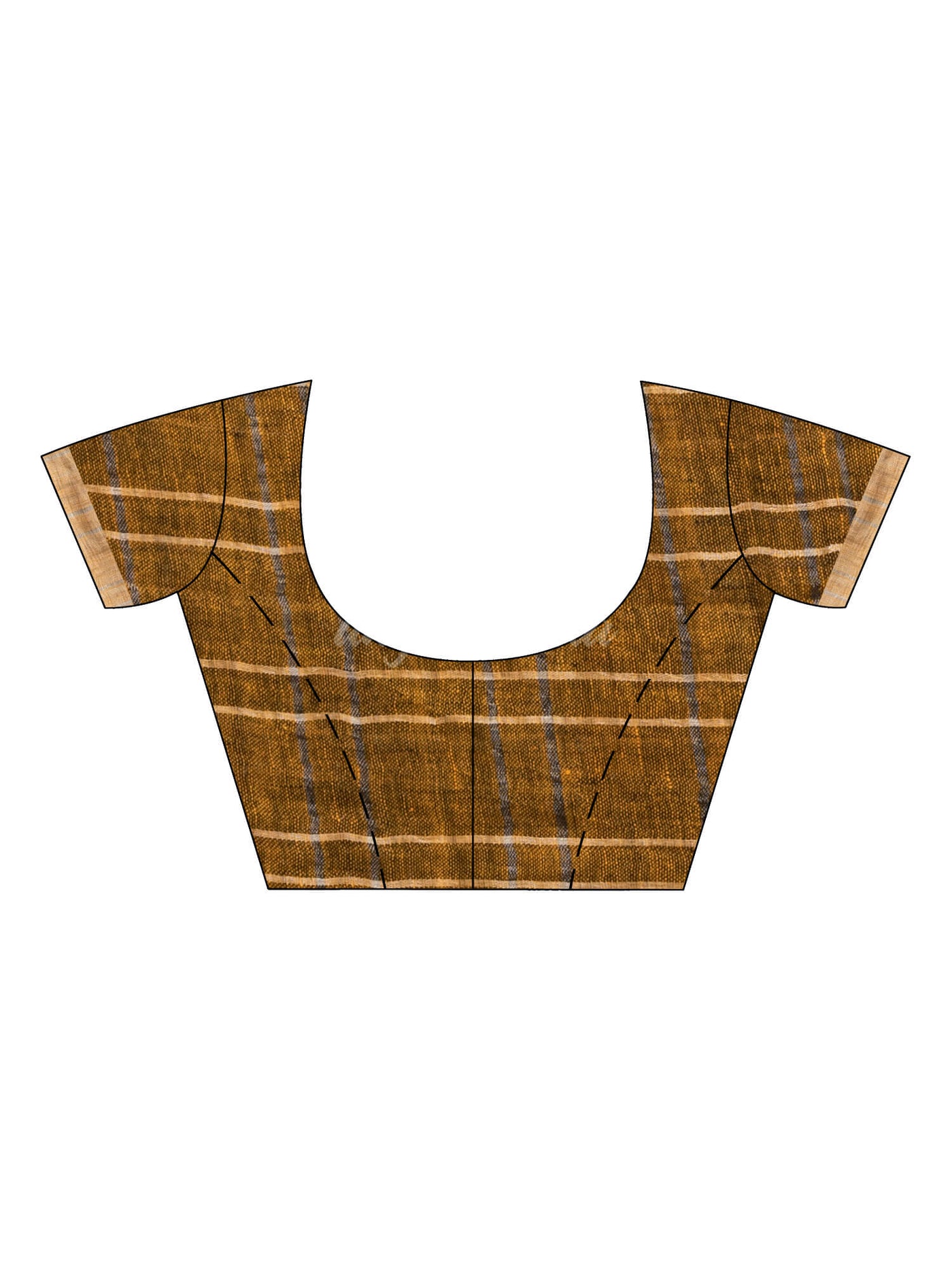 Description: Accentuate your ethnic ensemble by wearing this saree from Angoshobha. Sarees have their own grace, specially this one. This saree from Angoshobha is a beautiful Golden browen handloom saree. with check linen work all over.The border of the sari is disguised with silver color .The hem of the sari is disguised with golden browen color and an attached blouse piece. Crafted in a linen fabric, this beauty gives the most comfortable fit. Style of it with minimal jewellery and high heels to slay the ethnic look.You can wear anywhere and any festival moment with wonderful enjoyment.So collect this product and enjoy with wearing linen saree. Obviously you can trust on this collection. We are always with your fashion and choice.