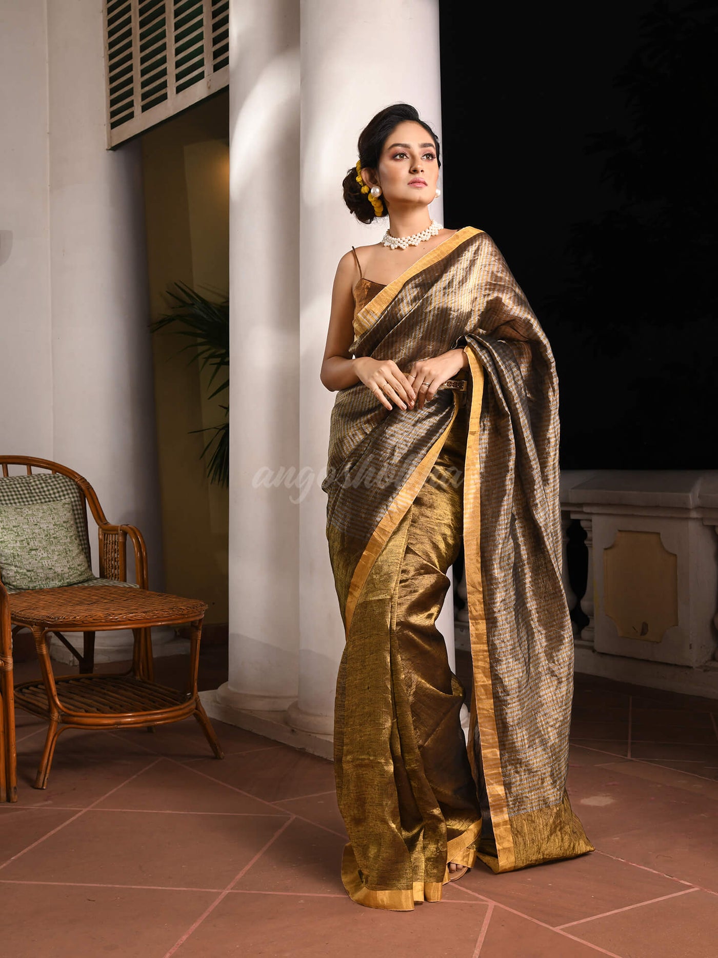 Golden Linen With Pallu Silver Zari Check Handwoven Tissue Saree