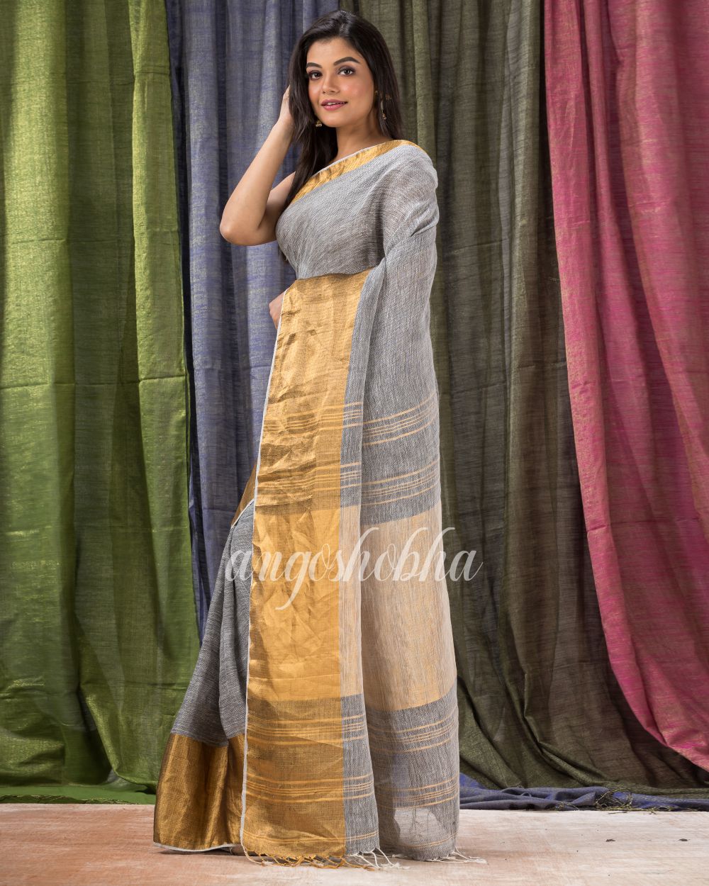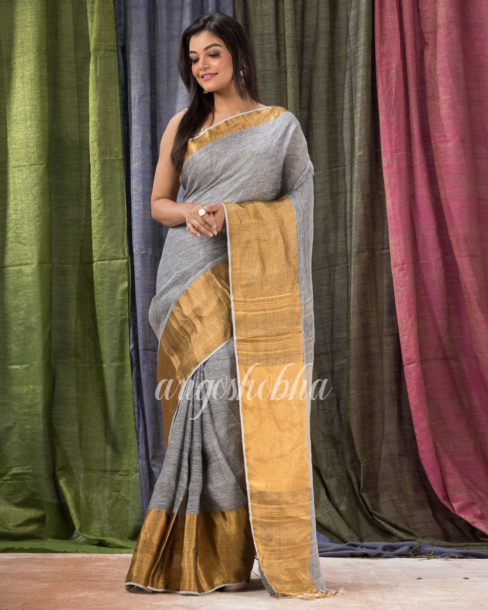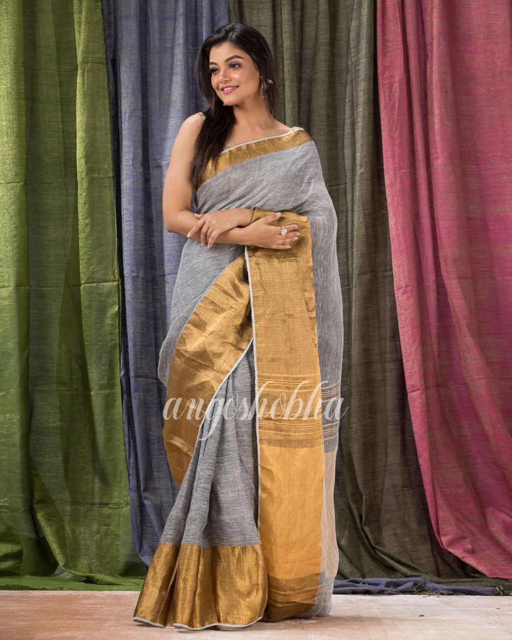 Description: Accentuate your ethnic ensemble by wearing this saree from Angoshobha. Sarees have their own grace, specially this one.This saree from Angoshobha is a beautiful grey handloom saree with textured linen work all over.The border of the sari is disguised with golden zari color.The hem of the sari is disguised with grey and golden combination attached with blouse piece.Crafted in a linen fabric, this beauty gives the most comfortable fit. Style of it with minimal jewellery and high heels to slay the ethnic look.You can wear anywhere and any festival moment with wonderful enjoyment.So collect this product and enjoy with wearing linen saree. Obviously you can trust on this collection. We are always with your fashion and choice.