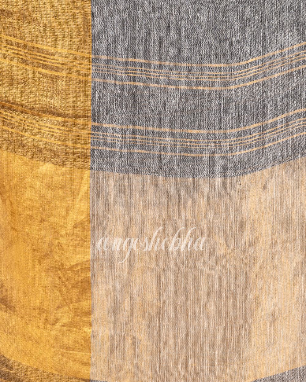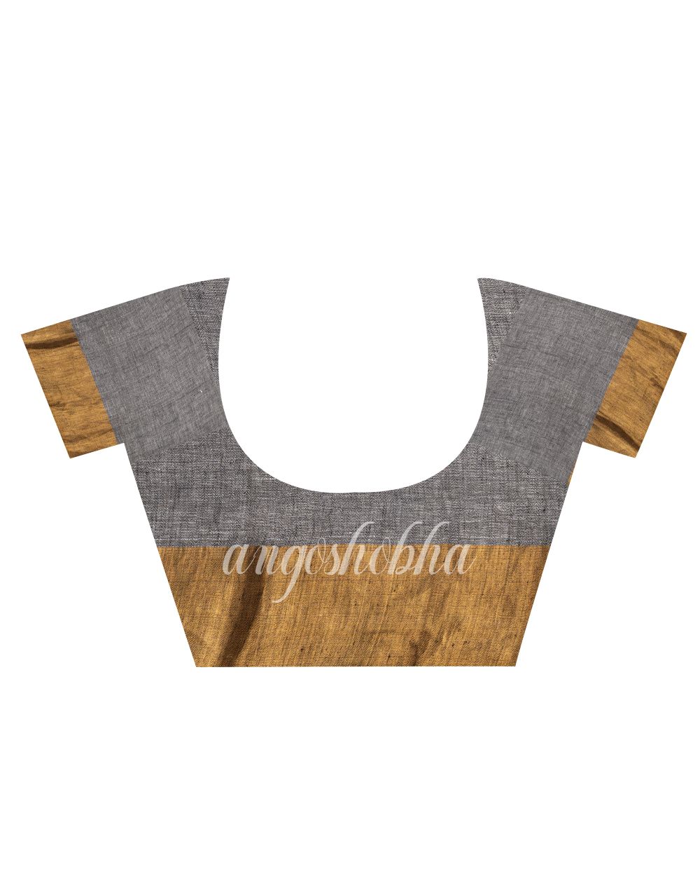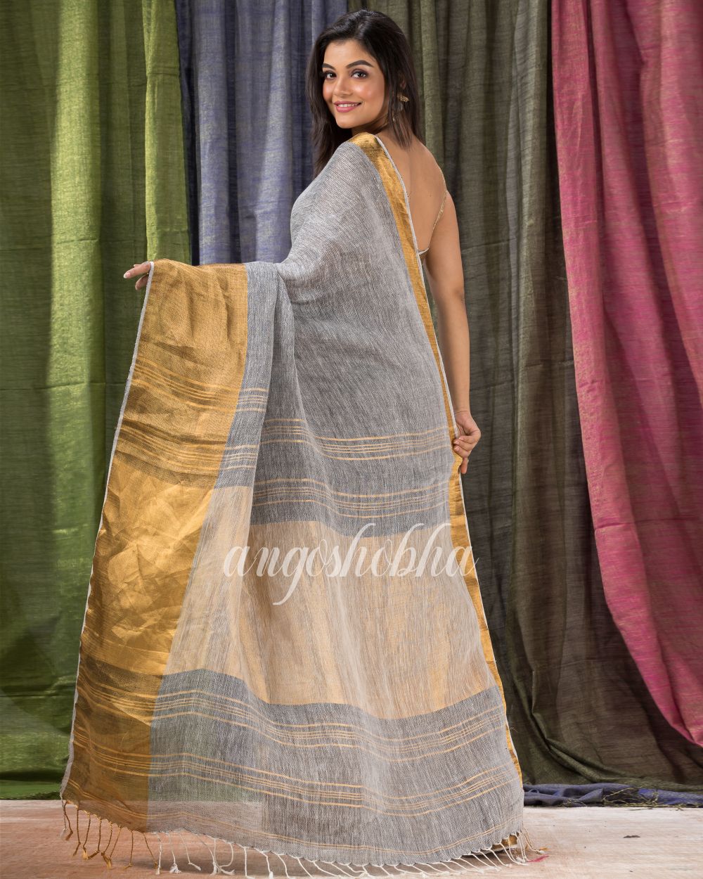 Description: Accentuate your ethnic ensemble by wearing this saree from Angoshobha. Sarees have their own grace, specially this one.This saree from Angoshobha is a beautiful grey handloom saree with textured linen work all over.The border of the sari is disguised with golden zari color.The hem of the sari is disguised with grey and golden combination attached with blouse piece.Crafted in a linen fabric, this beauty gives the most comfortable fit. Style of it with minimal jewellery and high heels to slay the ethnic look.You can wear anywhere and any festival moment with wonderful enjoyment.So collect this product and enjoy with wearing linen saree. Obviously you can trust on this collection. We are always with your fashion and choice.
