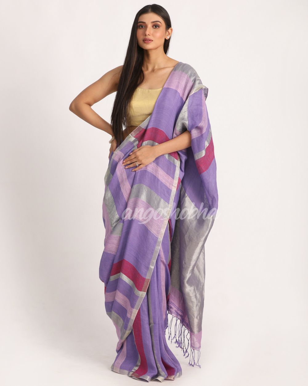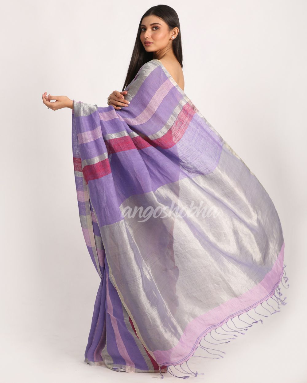Description: Accentuate your ethnic ensemble by wearing this saree from Angoshobha. Sarees have their own grace, specially this one. This saree from Angoshobha is a beautiful lavender handloom saree with handwoven check linen work all over.The border of the sari is disguised with silver color.The hem of the sari is disguised with multi color and an attached blouse piece. Crafted in a linen fabric, this beauty gives the most comfortable fit. Style of it with minimal jewellery and high heels to slay the ethnic look.You can wear anywhere and any festival moment with wonderful enjoyment.So collect this product and enjoy with wearing linen saree. Obviously you can trust on this collection. We are always with your fashion and choice.